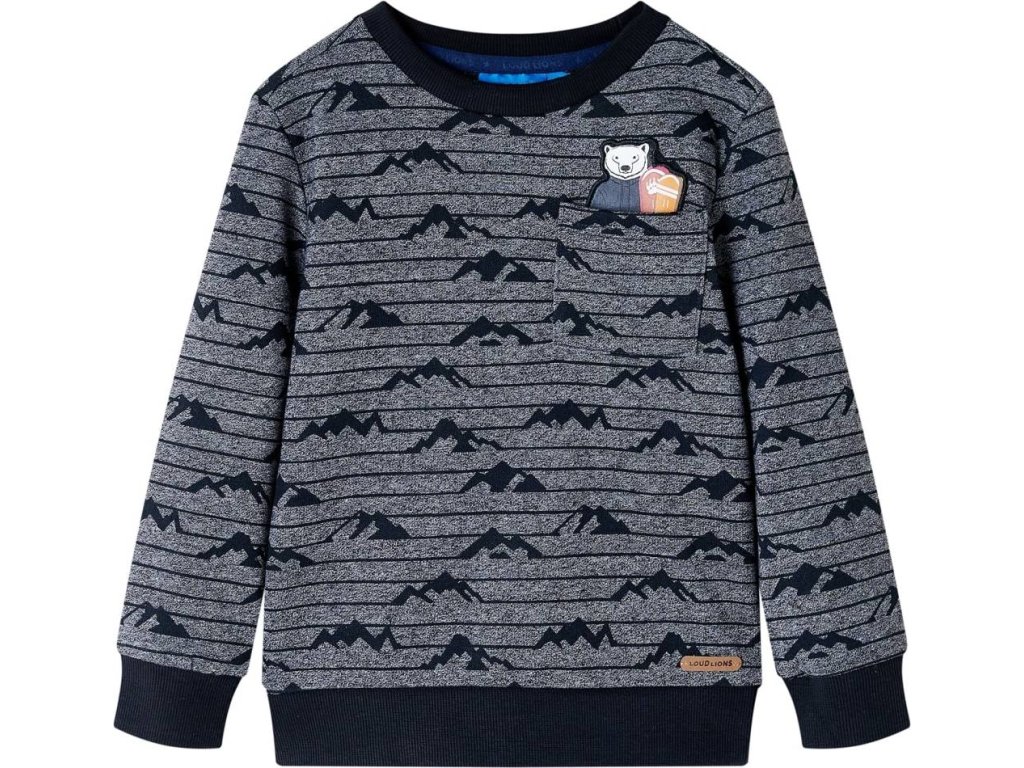 Tato dětská mikina má dlouhé rukávy, kulatý výstřih, jednu náprsní kapsu a žebrované lemy na manžetách, u výstřihu a ve spodní části. Dětská mikina má pruhy, potisk hor a nášivku s vyšívaným medvědem. Dětská mikina je vyrobena z 50 % z bavlny a 50 % z polyesteru, takže je pohodlná a prodyšná. Má měkkou fleecovou podšívku, takže je velmi teplá.