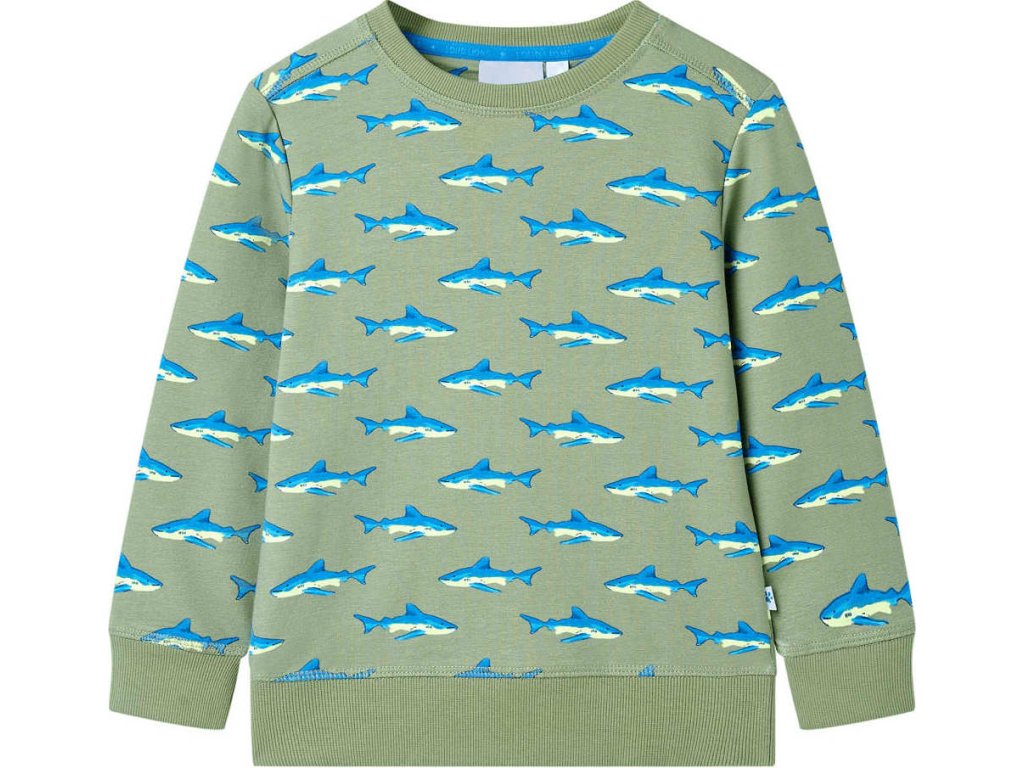 Tato dětská mikina má dlouhé rukávy, kulatý výstřih a žebrované okraje na manžetách, výstřihu a spodní části. Dětská mikina je celá potištěna žraloky. Mikina pro děti je vyrobena z měkkého materiálu s 95 % bavlny a 5 % elastanu, takže je pohodlná a prodyšná.