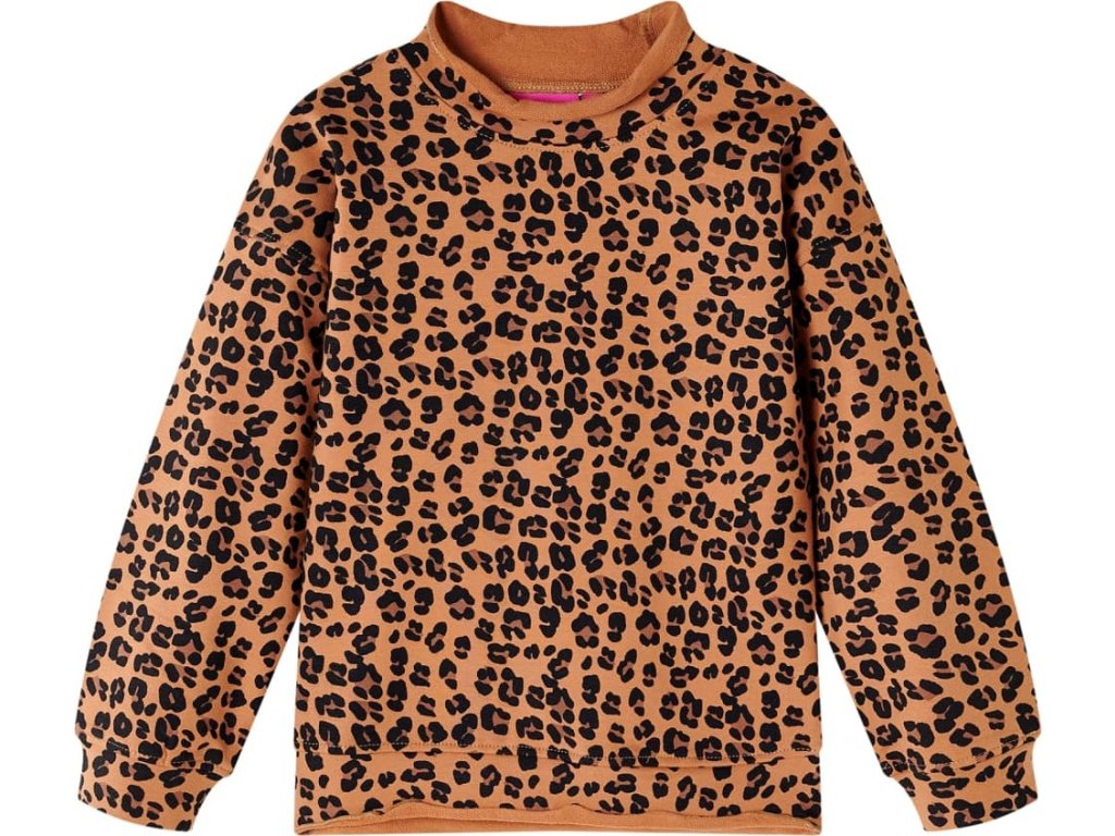 Tato dětská mikina má dlouhé rukávy, leopardí potisk, ohrnutý rolák a volný střih. Toto světle koňakové dětské oblečení má zvlněný lem s mírně nařaseným okrajem. Dětská mikina je vyrobena z měkkého materiálu s 95 % podílem bavlny a 5 % podílem elastanu, takže poskytuje mimořádné pohodlí a hřejivost.