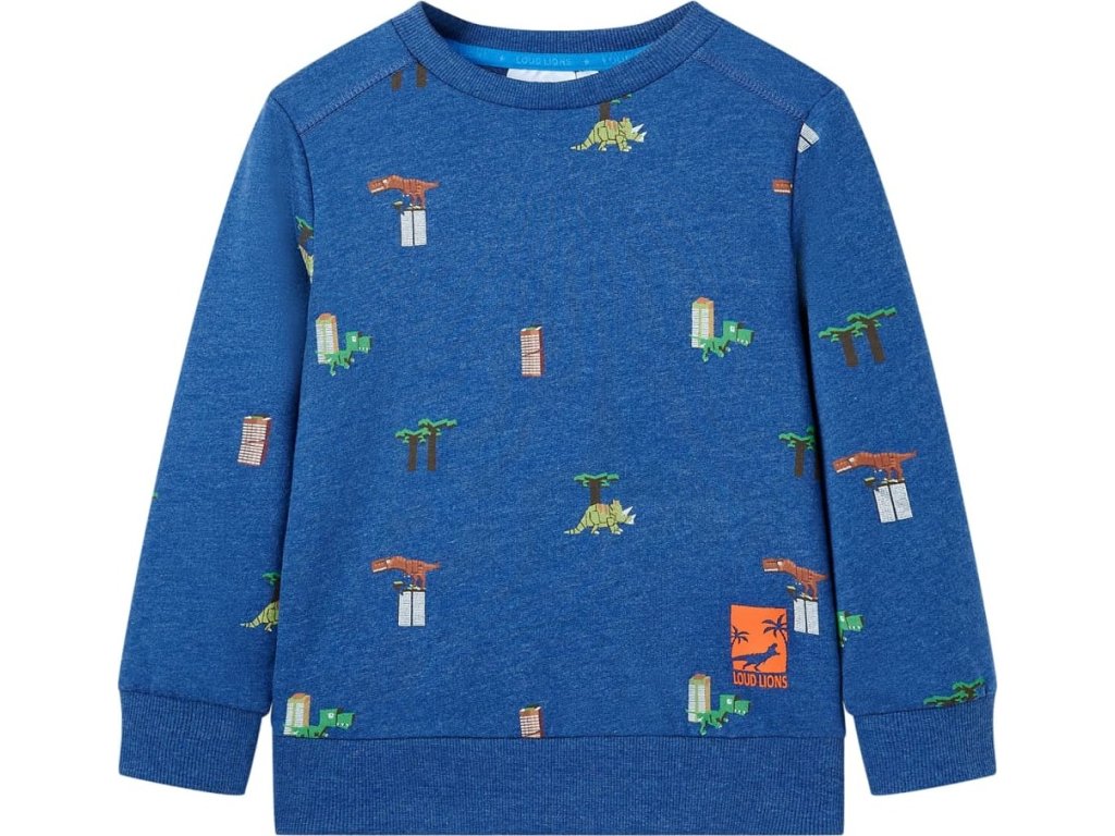 Tato dětská mikina má dlouhé rukávy, kulatý výstřih a žebrované okraje na manžetách, výstřihu a spodní části. Dětská mikina je celá potištěna dinosaury a stromy. Dětská mikina je vyrobena z měkkého materiálu, který obsahuje 80 % česané bavlny a 20 % polyesteru, takže je pohodlná a prodyšná.