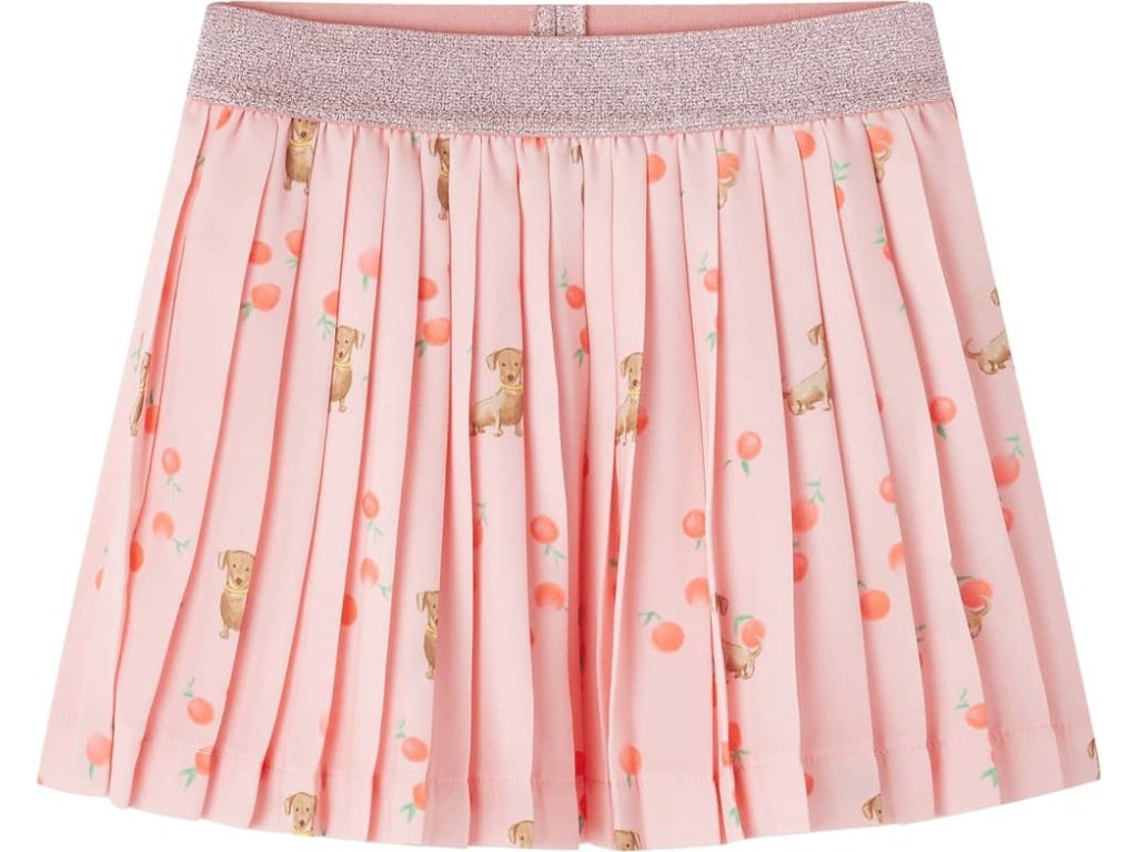 Tato dětská plisovaná sukně má široký elastický pas v třpytivé růžové barvě a áčkový střih. Dětská sukně má po celé ploše potisk štěňátek a ovoce. Dětská sukně je vyrobena z měkkého materiálu obsahující bavlnu, elastan a polyester pro větší pohodlí a prodyšnost.