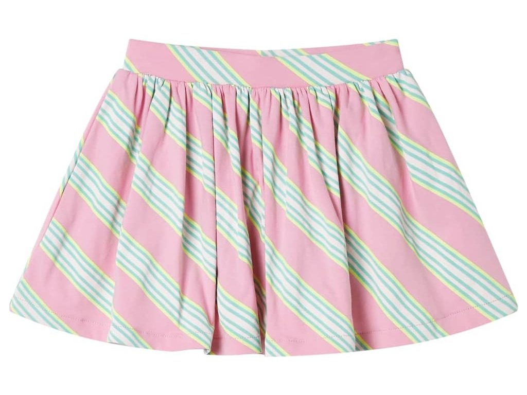 Tato dětská sukně má áčkový střih a elastický pas. Tato dětská sukně je celá potištěna diagonálními pruhy. Dětská krátká sukně je vyrobena z měkkého materiálu s 95 % bavlny a 5 % elastanu pro větší pohodlí a prodyšnost.