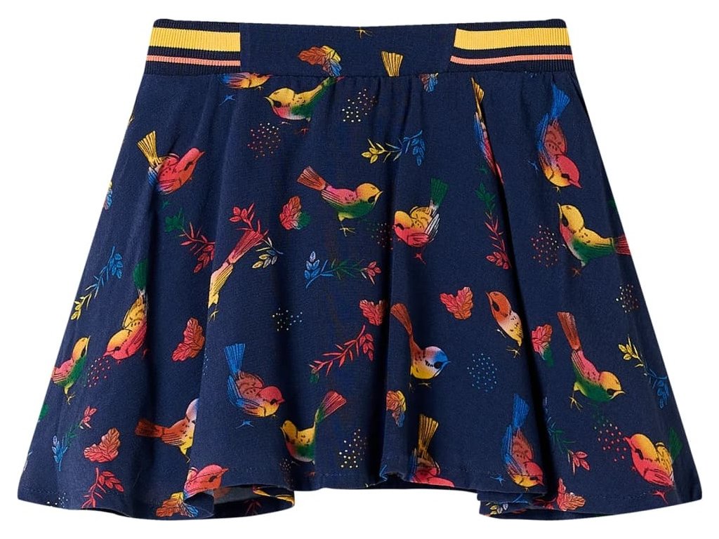 Tato dětská sukně má áčkový střih a elastický pas. Tato dětská sukně je celá potištěna barevnými ptáčky. Dětská krátká sukně je vyrobena z měkkého materiálu, který obsahuje viskózu a polyester, takže je velmi pohodlná a prodyšná.