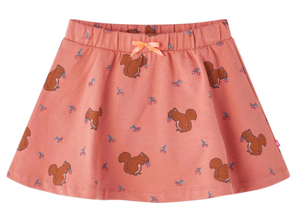 Tato dětská sukně má úzký elastický pas a rozšířený lem. Dívčí sukně je celá potištěna veverkami. Sukně pro dívky má mašličku v pase. Dětská sukně je vyrobena z měkké bavlny a elastanu pro větší pohodlí a prodyšnost.