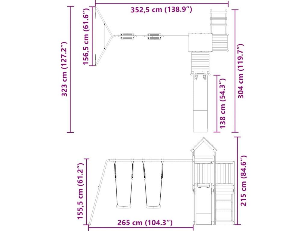 - Odolný materiál: Rám tohoto zahradního hřiště je vyroben z masivního borového dřeva. Masivní borové dřevo je známé svou pevností a dlouhou životností. Jeho rovná textura a výrazné suky přispívají k jeho rustikálnímu kouzlu.