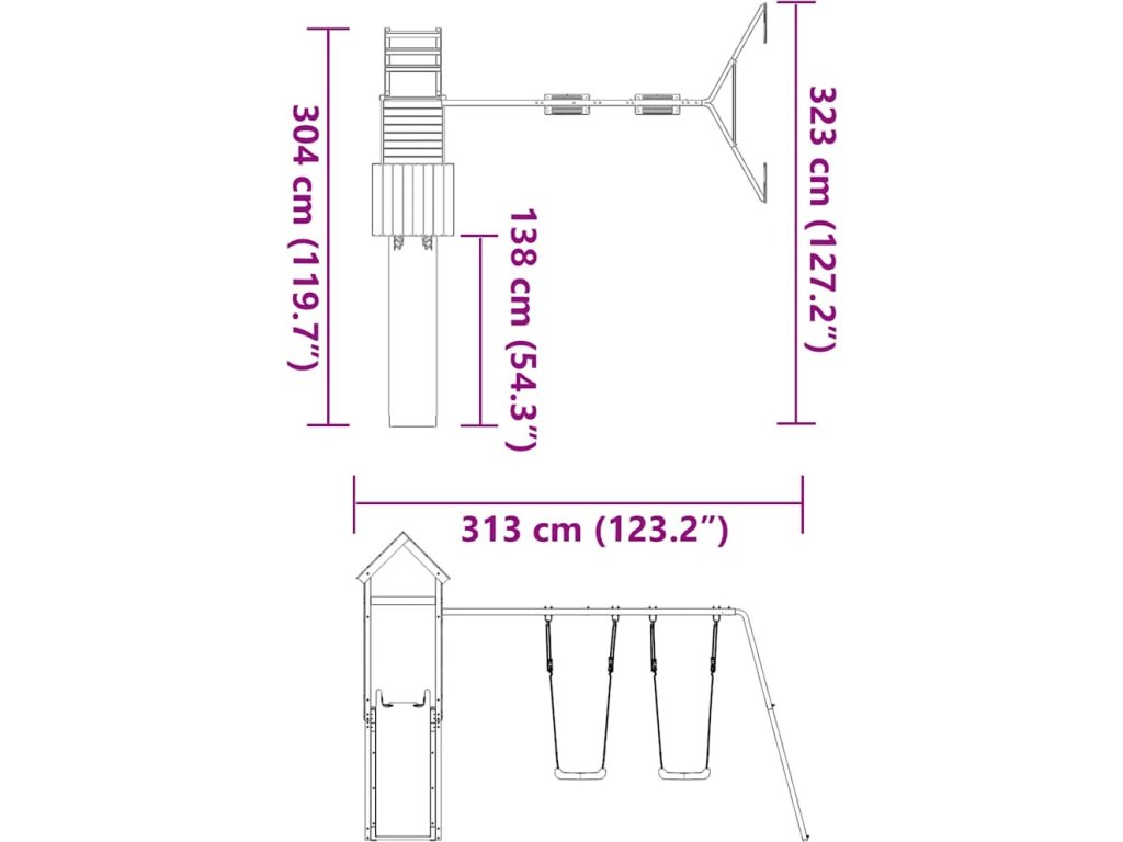 - Stabilní dřevěný rám: Dřevěný rám zahradní hrací věže zajišťuje mimořádnou pevnost a stabilitu. Nohy dětské houpačky ve tvaru písmene A navíc zajišťují potřebnou rovnováhu.