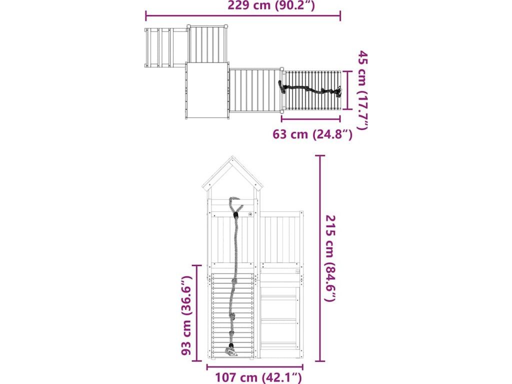 - Stabilní dřevěný rám: Dřevěný rám zahradní hrací věže zajišťuje mimořádnou pevnost a stabilitu.