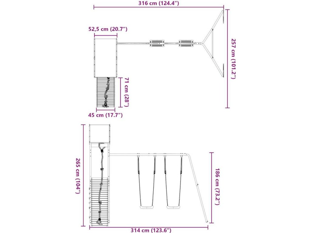 - Stabilní dřevěný rám: Dřevěný rám zahradní hrací věže zajišťuje mimořádnou pevnost a stabilitu. Nohy dětské houpačky ve tvaru písmene A navíc zajišťují potřebnou rovnováhu.