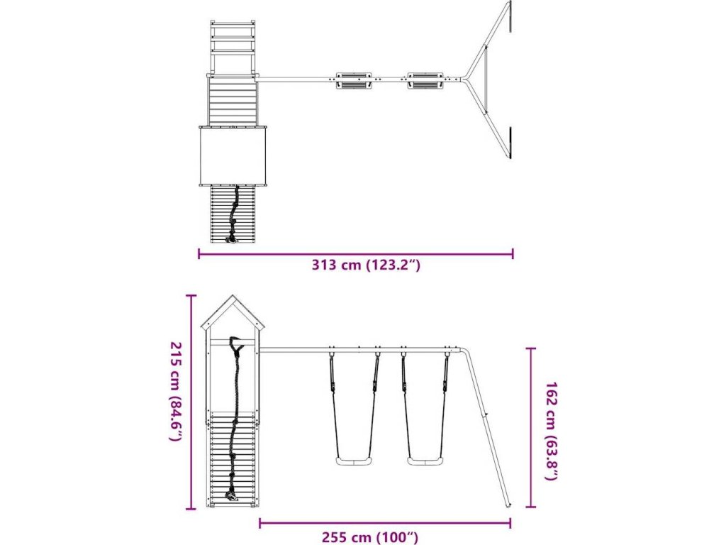 - Stabilní dřevěný rám: Dřevěný rám zahradní hrací věže zajišťuje mimořádnou pevnost a stabilitu. Nohy dětské houpačky ve tvaru písmene A navíc zajišťují potřebnou rovnováhu.