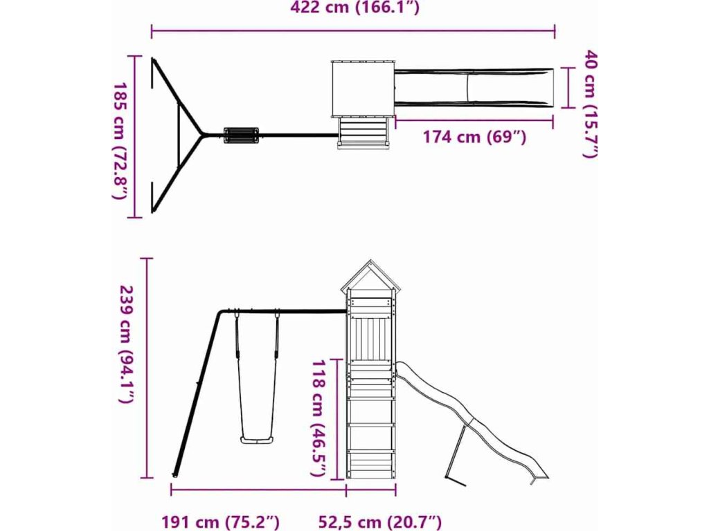 - Stabilní dřevěný rám: Dřevěný rám zahradní hrací věže zajišťuje mimořádnou pevnost a stabilitu. Nohy dětské houpačky ve tvaru písmene A navíc zajišťují potřebnou rovnováhu.