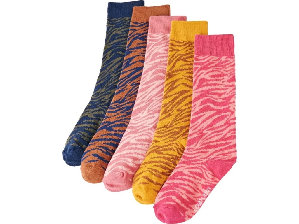 Tyto dětské ponožky mají po celé ploše zebří potisk. Ponožky mají zesílené paty a špičky, aby déle vydržely. Dětské ponožky jsou vyrobeny z tkaniny bohaté na bavlnu a udržují nohy v teple a suchu.