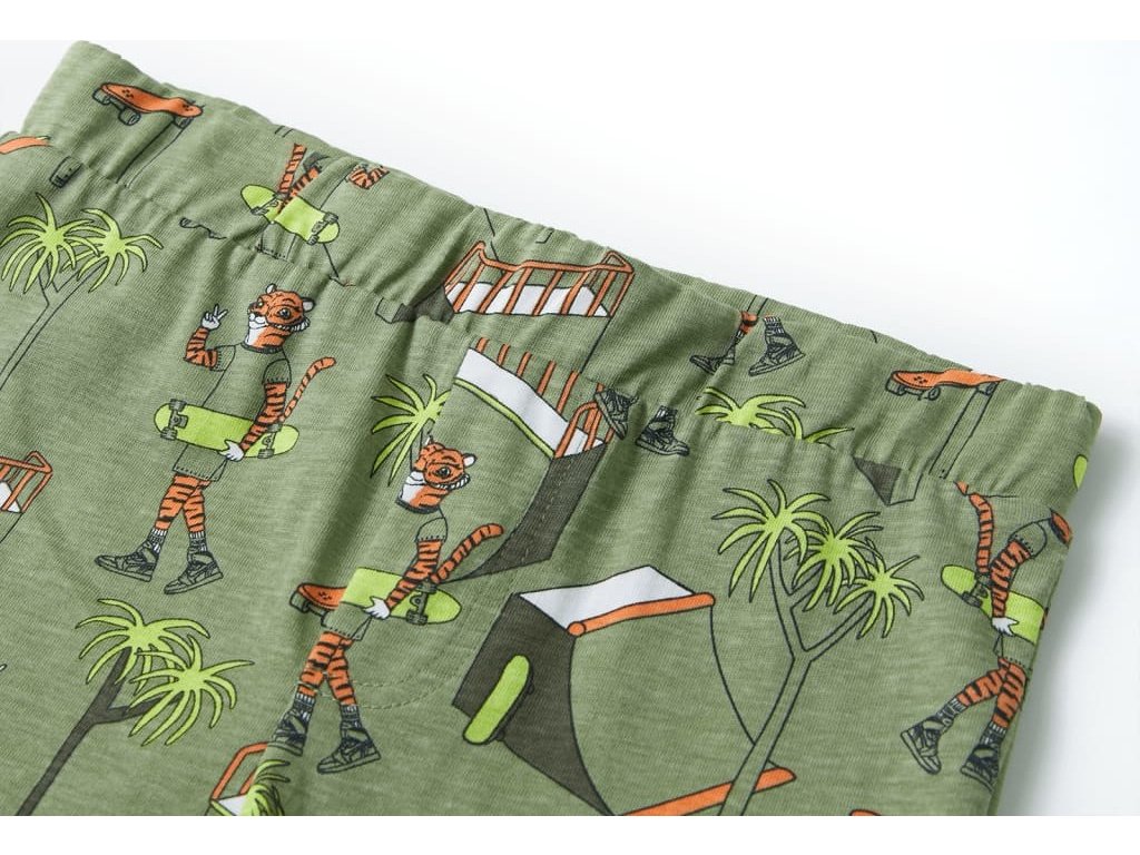 Toto dětské pyžamo s krátkým rukávy má kulatý výstřih, elastický pas a klasický střih. Dětské pyžamo má po celé ploše potisk s tygry a stromy. Dětské pyžamo je vyrobeno z měkkého materiálu se 100% bavlnou, takže je velmi pohodlné a prodyšné.