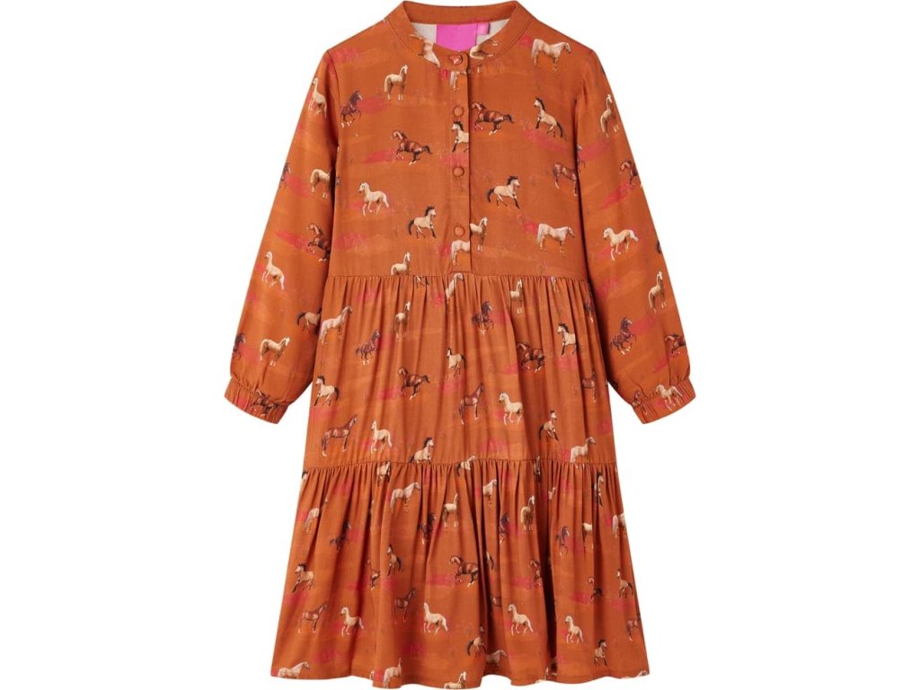 Tyto dětské šaty mají dlouhé rukávy, stojáček a zapínání vpředu na knoflíčky. Dívčí šaty mají potisk krásných koní, pružné manžety a nabírané švy v pase a na kolenou. Dětské šaty jsou vyrobené z lyocellu a jsou měkké a prodyšné.