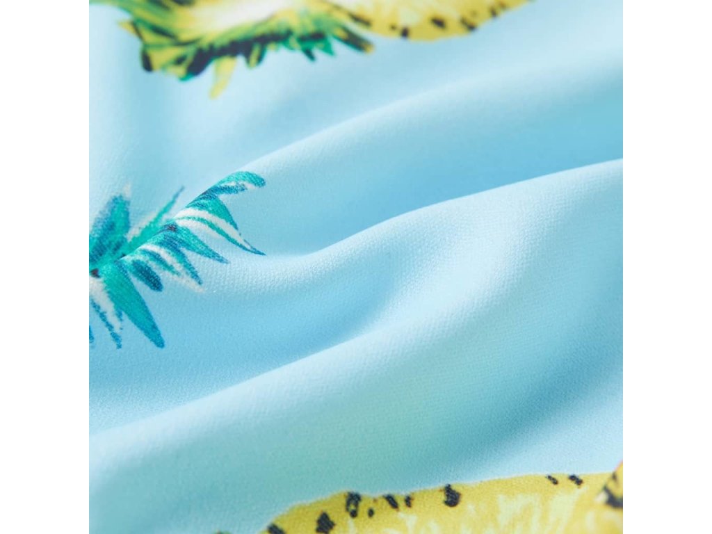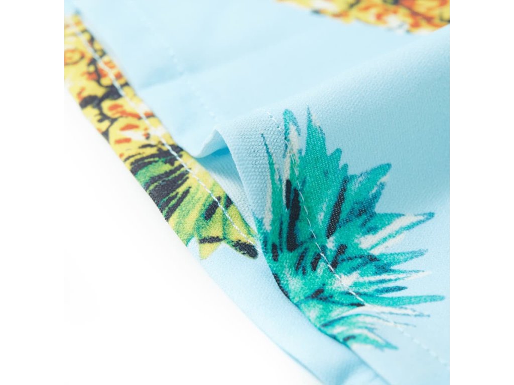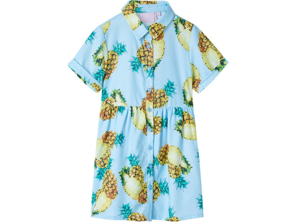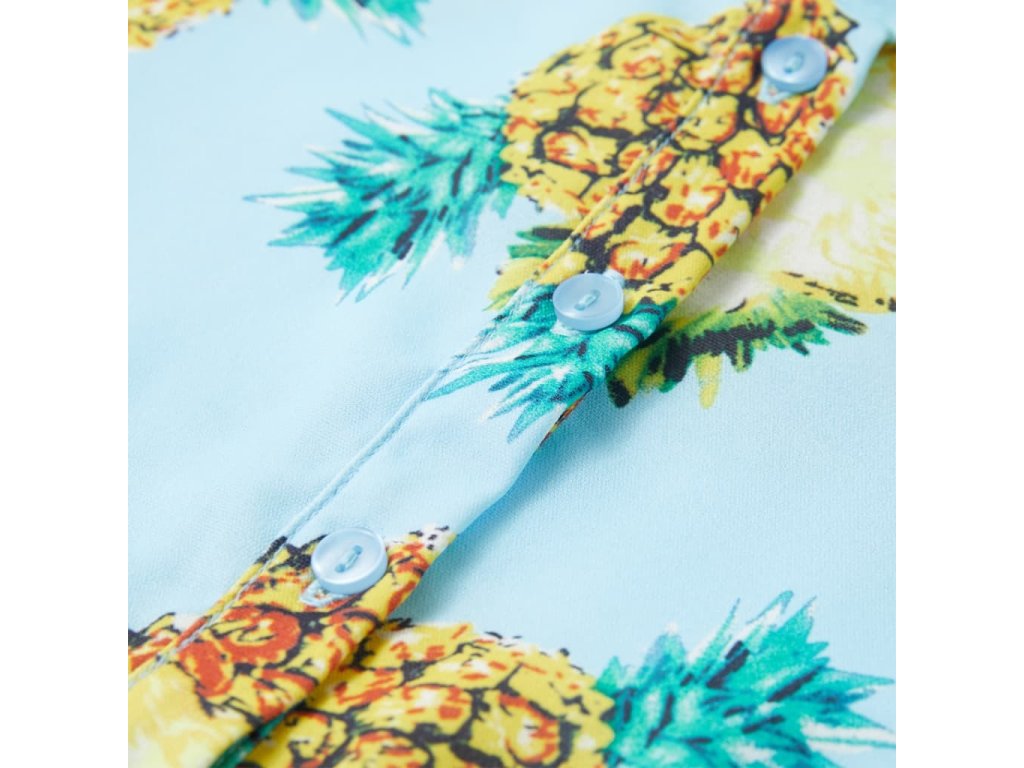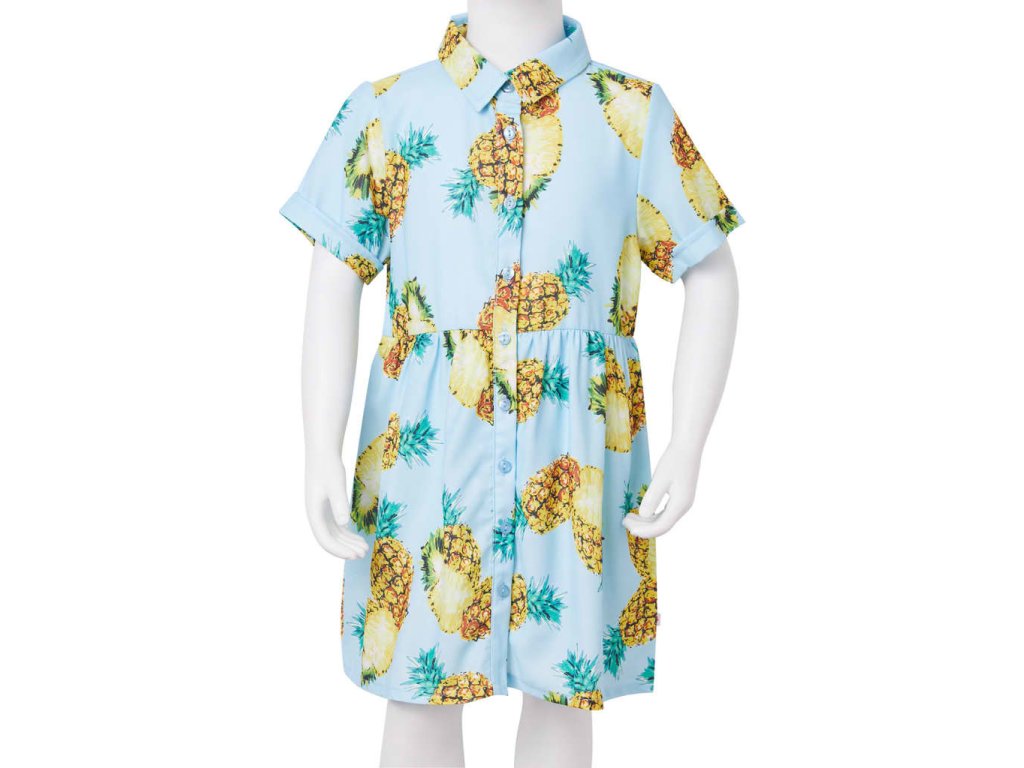 Tyto dětské šaty mají krátké rukávy, ohrnovací límec a zapínání vpředu na knoflíky. Tyto dětské šaty jsou celé potištěny ananasy. Dětské krátké šaty jsou vyrobeny z měkkého materiálu, který obsahuje 50 % polyesteru, 40 % viskózy a 10 % bavlny, takže jsou pohodlné a prodyšné.