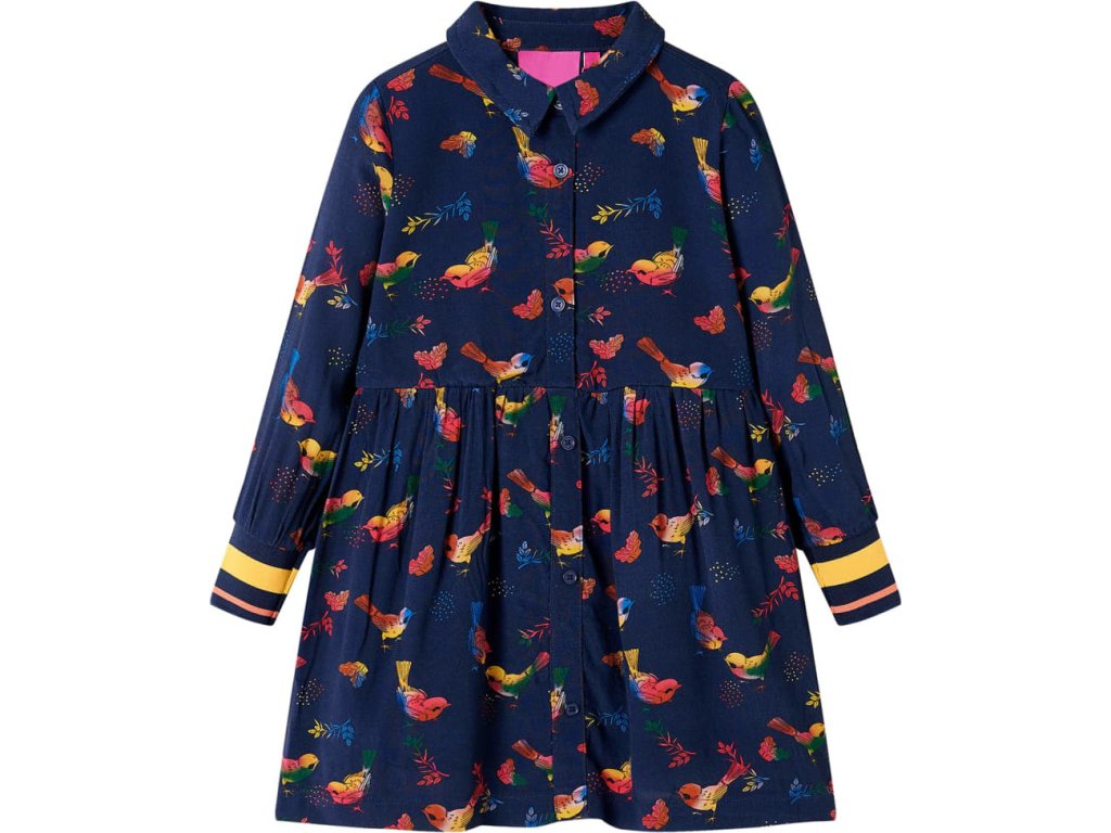 Tyto dětské šaty mají dlouhé rukávy, ohrnovací límec a zapínají se vpředu na knoflíky. Dětské šaty jsou celé potištěny barevnými ptáčky. Tyto dětské šaty s límečkem jsou vyrobeny z měkkého materiálu, který obsahuje viskózu a polyester, takže jsou pohodlné a prodyšné.