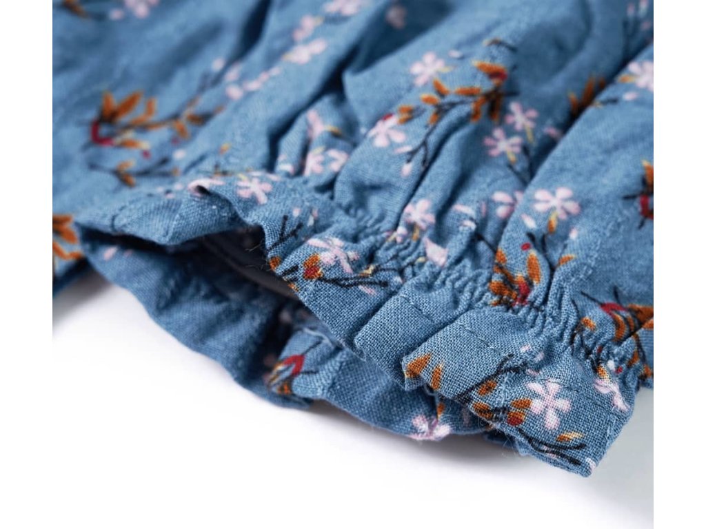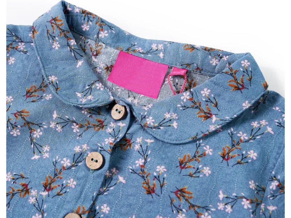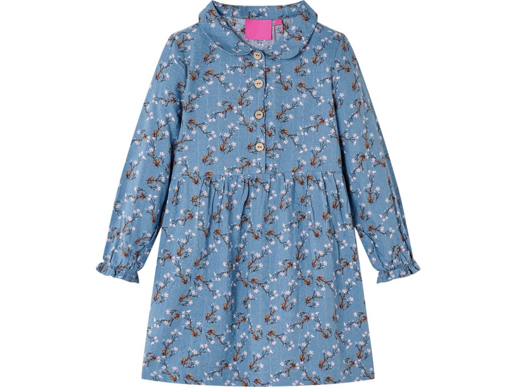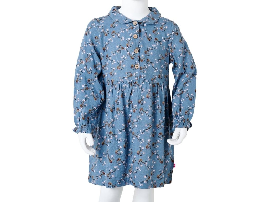 Tyto dětské šaty mají dlouhé rukávy, zahnutý límec a zapínání na řadu knoflíčků vpředu na hrudi. Šaty mají celoplošný květinový potisk a vypadají vskutku elegantně a krásně. Tyto dětské šaty jsou vyrobeny z 50 % z bavlny a 50 % umělého hedvábí, takže jsou velmi pohodlné a prodyšné.
