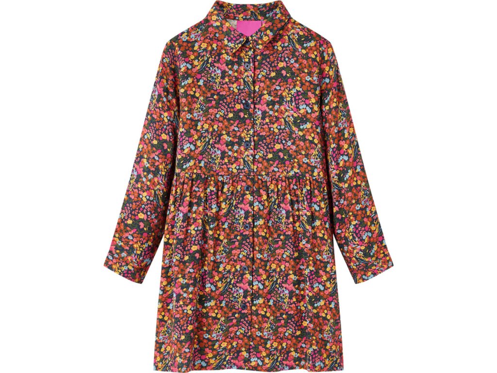 Tyto dětské šaty mají dlouhé rukávy, zahnutý límec a zapínání na řadu knoflíčků. Tyto vícebarevné dětské šaty jsou celé potištěny krásnými květinkami. Dětské krátké šaty jsou vyrobeny z měkkého materiálu, který obsahuje 100% lyocell, takže jsou velmi pohodlné a prodyšné.
