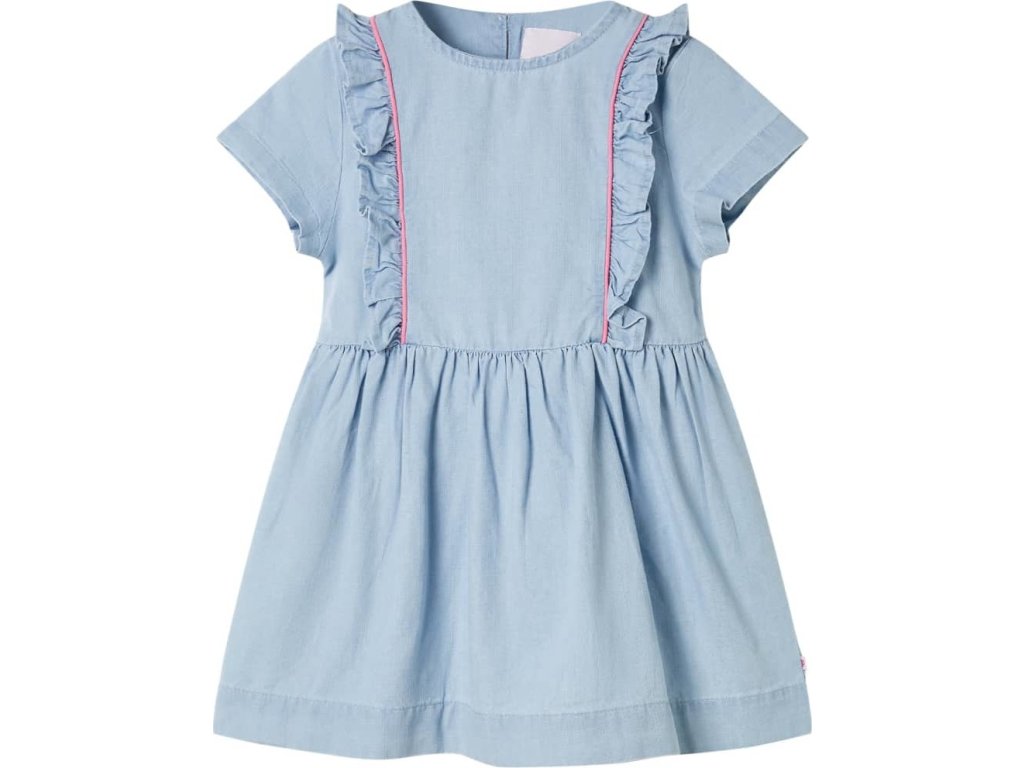 Tyto dětské šaty mají krátké rukávy, kulatý výstřih a zapínají se u krku na knoflík. Tyto bledě modré dětské šaty mají krásné volánky, které se táhnou od předního dílu podél rukávové vsadky. Dětské krátké šaty jsou vyrobeny z měkkého materiálu, který obsahuje 100% bavlnu, takže jsou pohodlné a prodyšné.