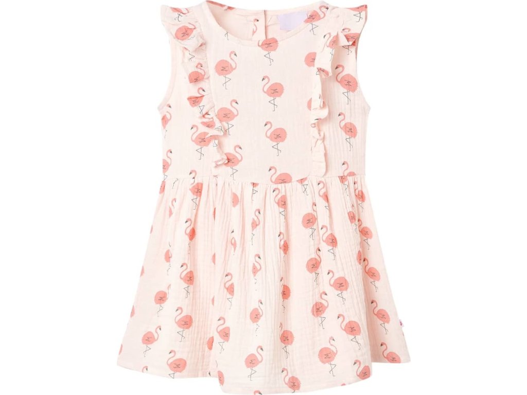 Tyto dětské šaty mají kulatý výstřih a zapínají se u krku na knoflíčky. Tyto bledě růžové dětské šaty mají krásné volánky, které se táhnou od předního dílu podél rukávové vsadky. Tyto šaty jsou celé potištěny plameňáky. Dětské krátké šaty jsou vyrobeny z měkkého materiálu, který obsahuje 100% bavlnu, takže jsou pohodlné a prodyšné.