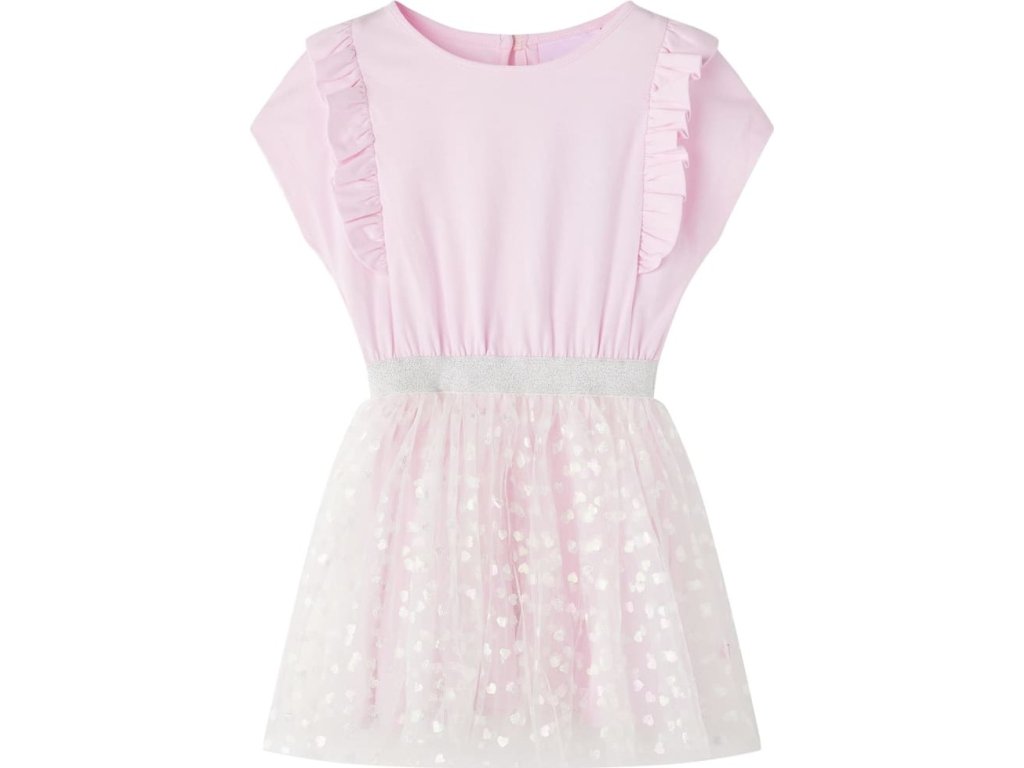 Tyto dětské šaty mají krátké rukávy, kulatý výstřih a zapínají se u krku na knoflík. Světle růžové dětské šaty mají krásné volánky, které se táhnou od předního dílu podél rukávové vsadky. Šaty mají splývavou tylovou sukni s potiskem lesklých srdíček. Dětské krátké šaty jsou vyrobeny z měkkého materiálu, který obsahuje bavlnu, elastan a polyester, takže jsou pohodlné a prodyšné.