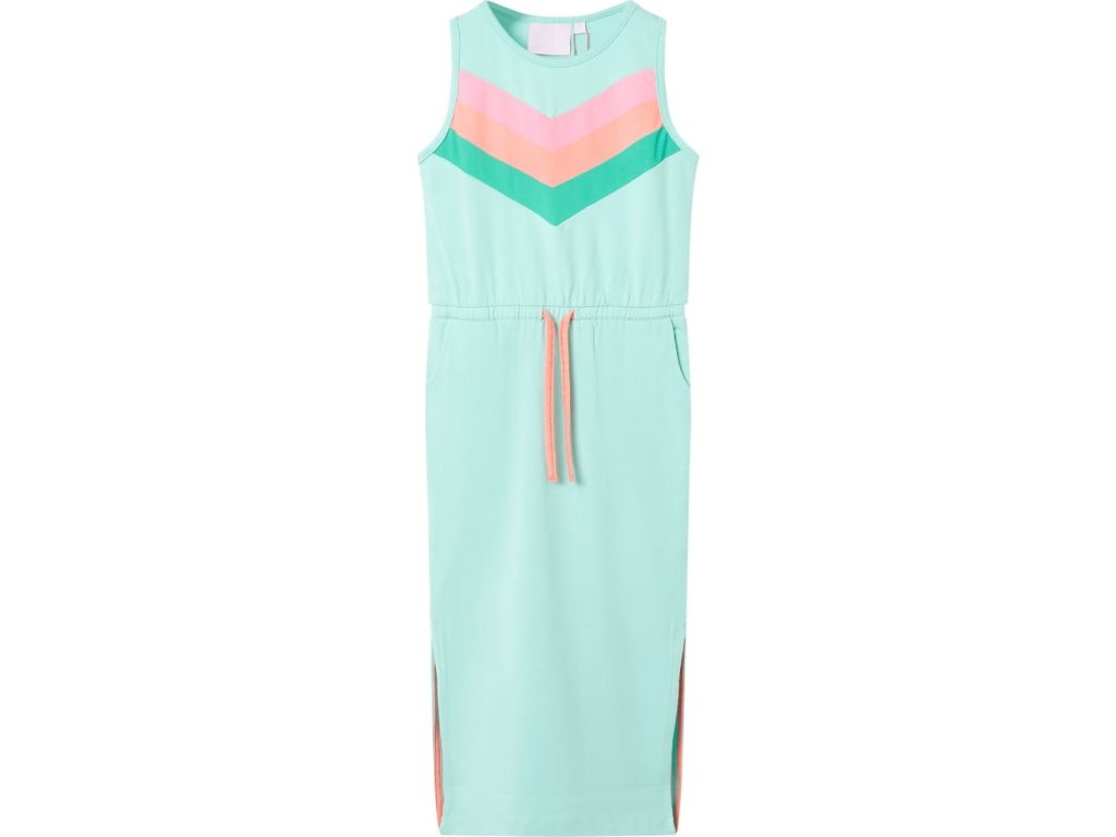 Tyto dětské šaty bez rukávů mají kulatý výstřih, dvě přední kapsy a elastický pas s nastavitelnou stahovací šňůrkou. Tyto světle mátové dětské šaty mají na hrudi barevné pruhy. Dívčí šaty jsou vyrobeny z měkkého materiálu, který obsahuje bavlnu a elastan, takže jsou pohodlné a prodyšné.