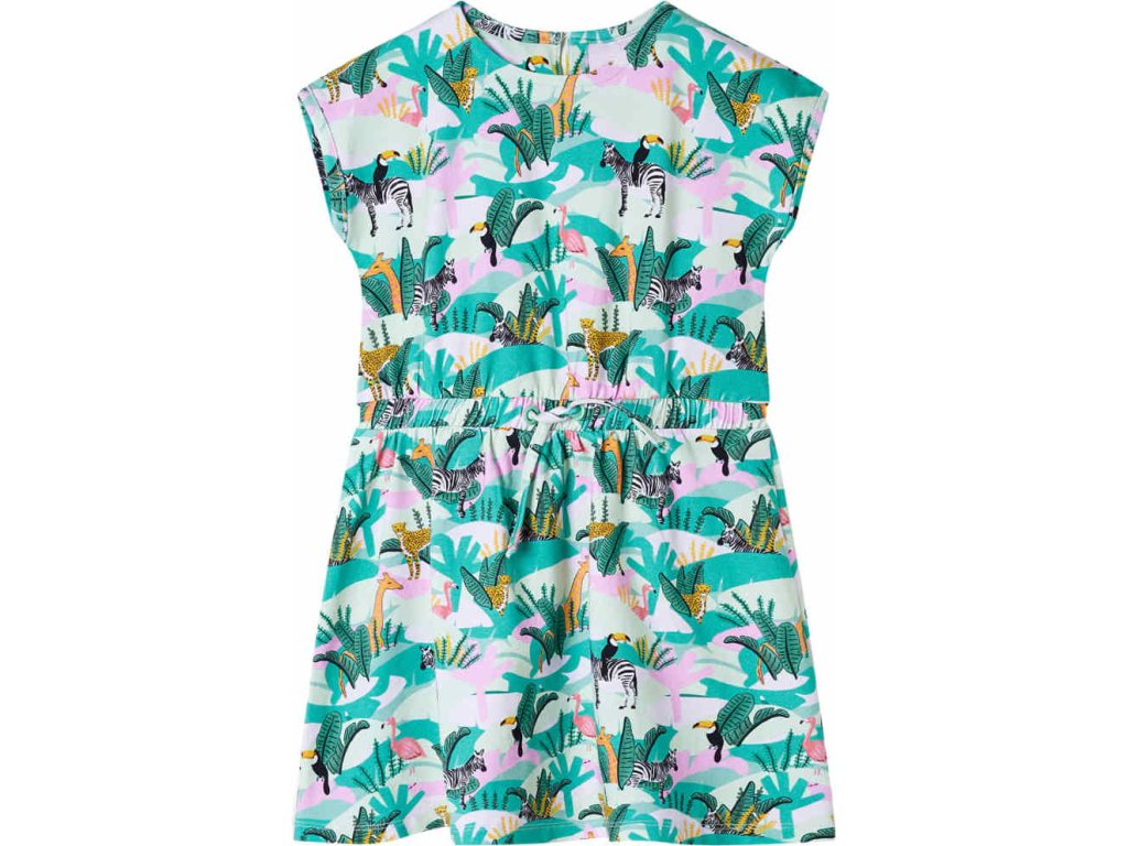 Tyto dětské šaty mají kulatý výstřih, přinechané rukávy, elastický pas se stahovací šňůrkou a u krku se zapínají na knoflíček. Tyto dětské šaty jsou celé potištěny zvířaty a flórou. Dětské krátké šaty jsou vyrobeny z měkkého materiálu, který obsahuje 92 % bavlny a 8 % elastanu, takže jsou pohodlné a prodyšné.