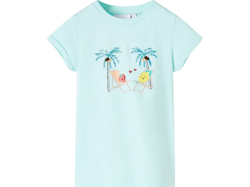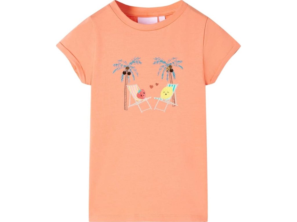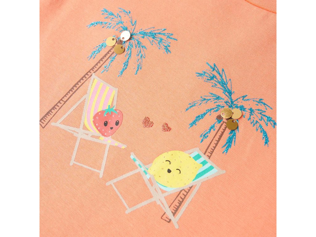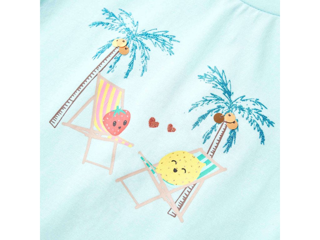 Toto dětské tričko má krátké rukávy, kulatý výstřih a rovný střih. Toto světle růžové tričko na sobě má 2 roztomilé ovocné postavičky, které se povalují na plážových lehátkách pod kokosovými palmami. Dětské tričko s krátkým rukávem je vyrobeno z měkkého materiálu s 95 % bavlny a 5 % elastanu, takže je velmi pohodlné a prodyšné.