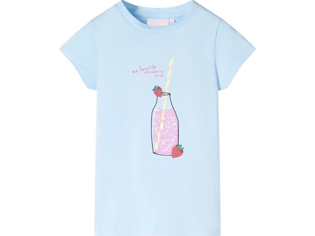 Toto dětské tričko má krátké rukávy, kulatý výstřih a rovný střih. Dětské tričko má na přední straně láhev jahodového nápoje. Dětské tričko je vyrobeno z bavlny a elastanu, takže je měkké a příjemné na dotek.