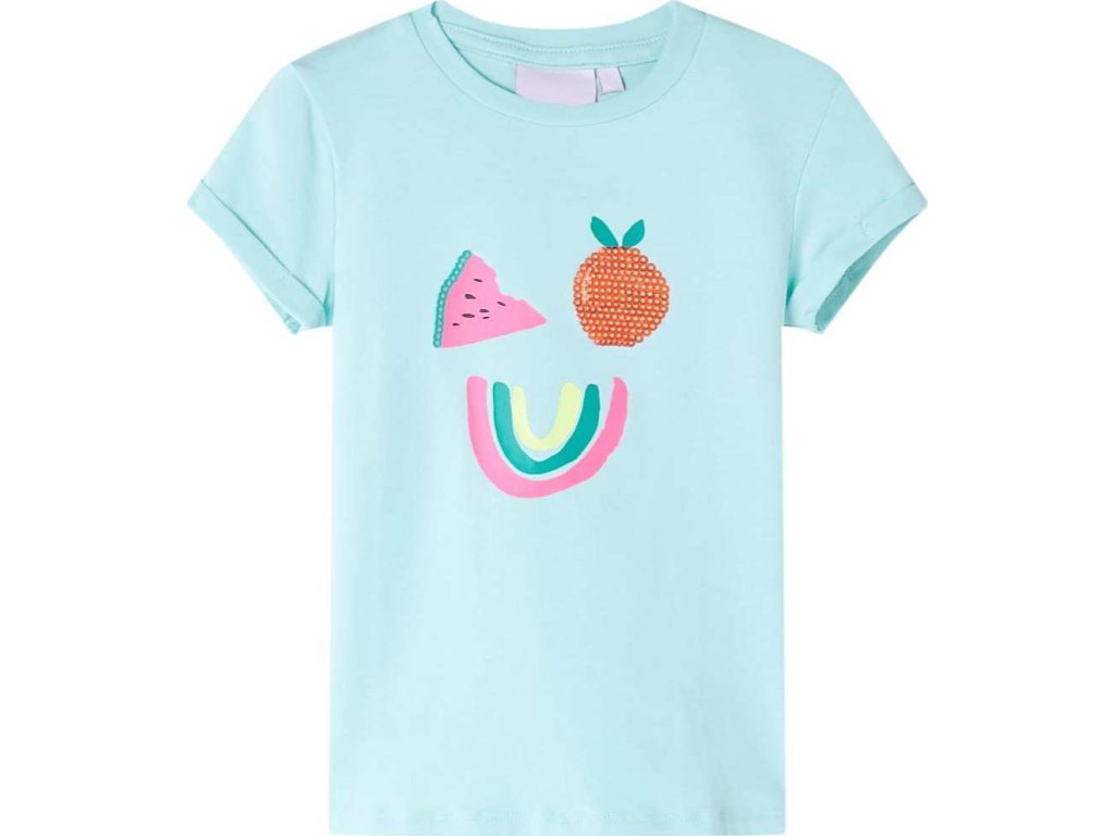 Toto dětské tričko má ohrnuté krátké rukávy, kulatý výstřih a rovný střih. Dětské tričko má na sobě barevný meloun a flitrové jablko, což mu dodává na kráse a hravosti. Dětské tričko s krátkým rukávem je vyrobeno z měkkého materiálu s 95 % bavlny a 5 % elastanu, takže je velmi pohodlné a elastické.