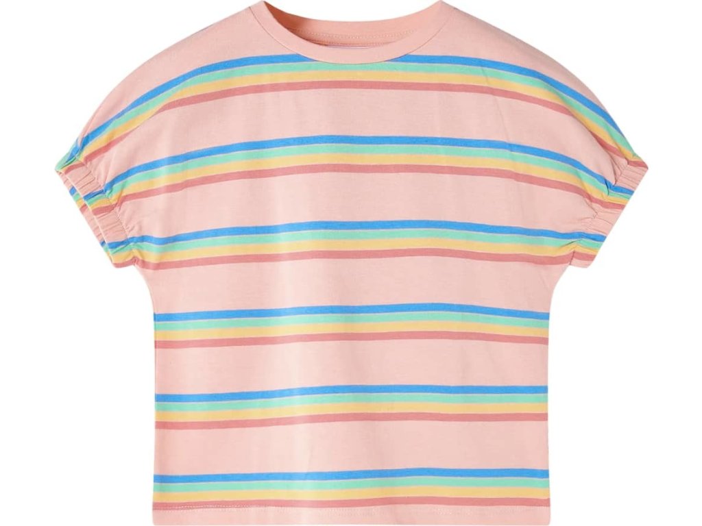 Toto dětské tričko má krátké rukávy s elastickým lemem, kulatý výstřih a rovný střih. Toto tričko v broskvovém odstínu má duhové pruhy. Dětské tričko s krátkým rukávem je vyrobeno z měkkého materiálu s 95 % bavlny a 5 % elastanu, takže je velmi pohodlné a prodyšné.