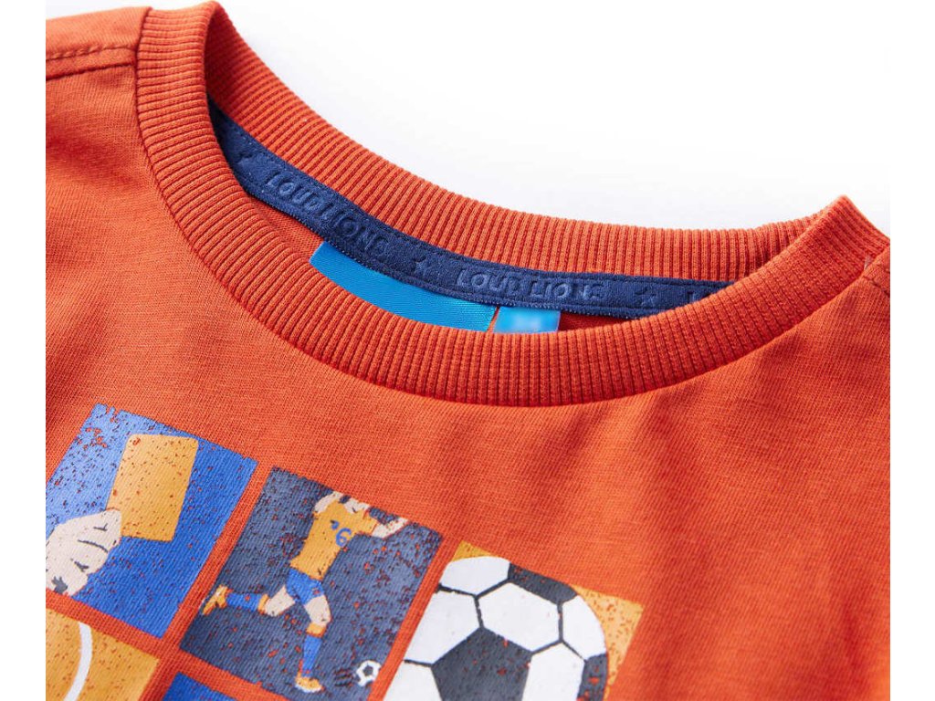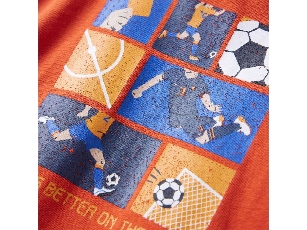 Toto dětské tričko má dlouhé rukávy, kulatý výstřih a rovný střih. Na tomto oranžovém tričku je potisk s motivy fotbalového zápasu. Dětské tričko s dlouhým rukávem je vyrobeno z měkkého materiálu s 80 % bavlny a 20 % viskózy, takže je velmi pohodlné a prodyšné.