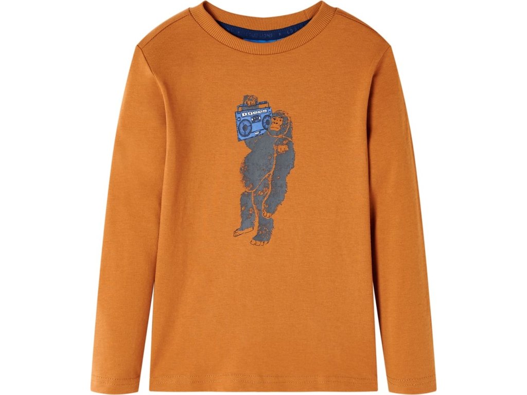 Toto dětské tričko má dlouhé rukávy, kulatý výstřih a rovný střih. Na tomto tmavě okrovém tričku je velká gorila s kazeťákem. Dětské tričko s dlouhým rukávem je vyrobeno ze 100% bavlny, která je měkká a příjemná na dotek.