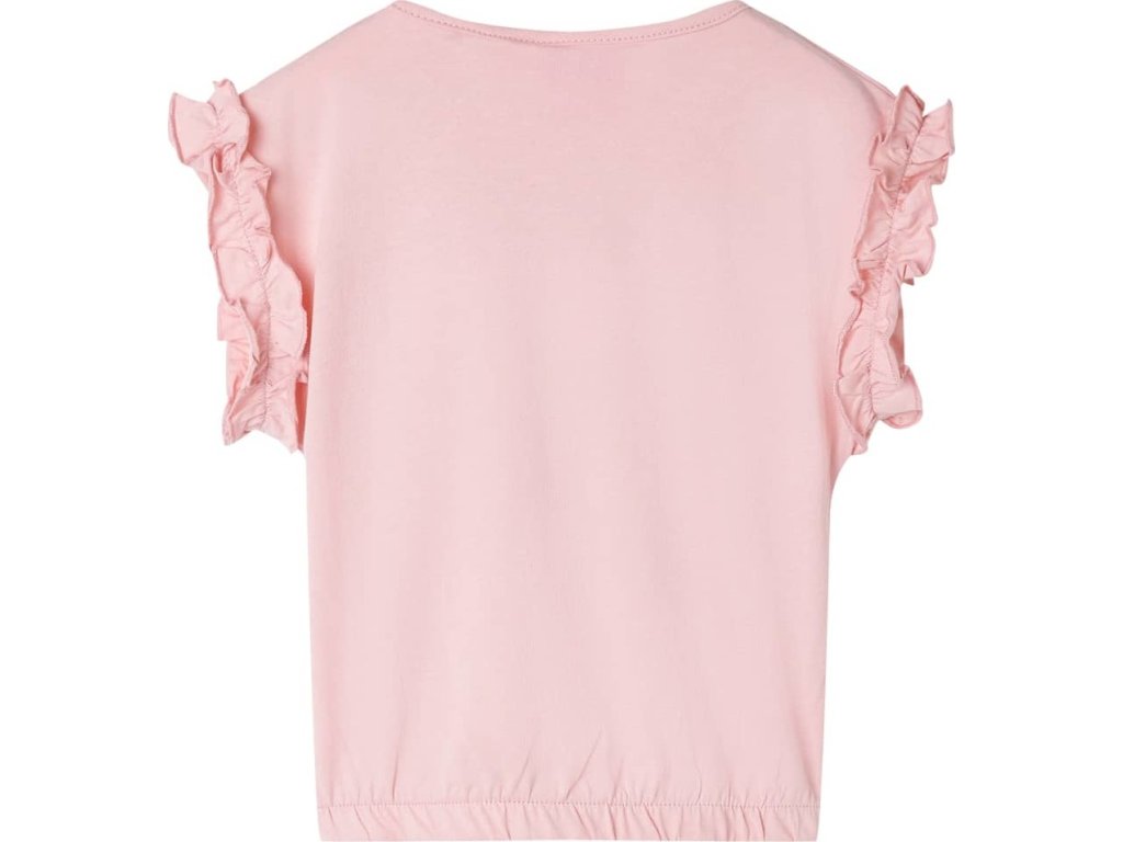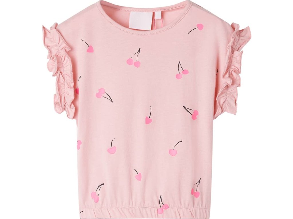Toto dětské tričko má volánkové rukávy, kulatý výstřih a rovný střih. Dětské tričko má na přední straně roztomilé třešně a elastický spodní lem. Dětské tričko je vyrobeno ze 100% bavlny, takže je měkké a příjemné na dotek.