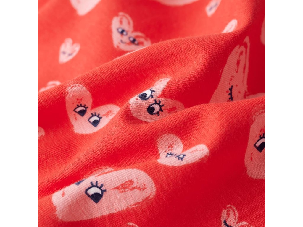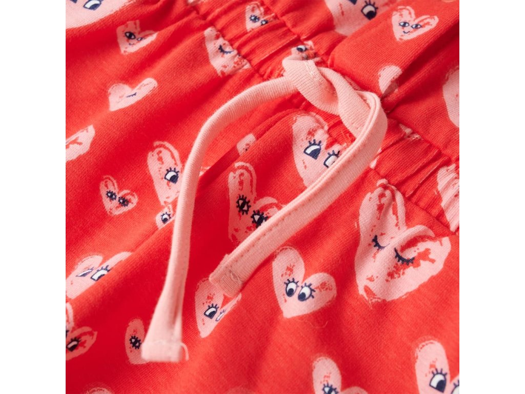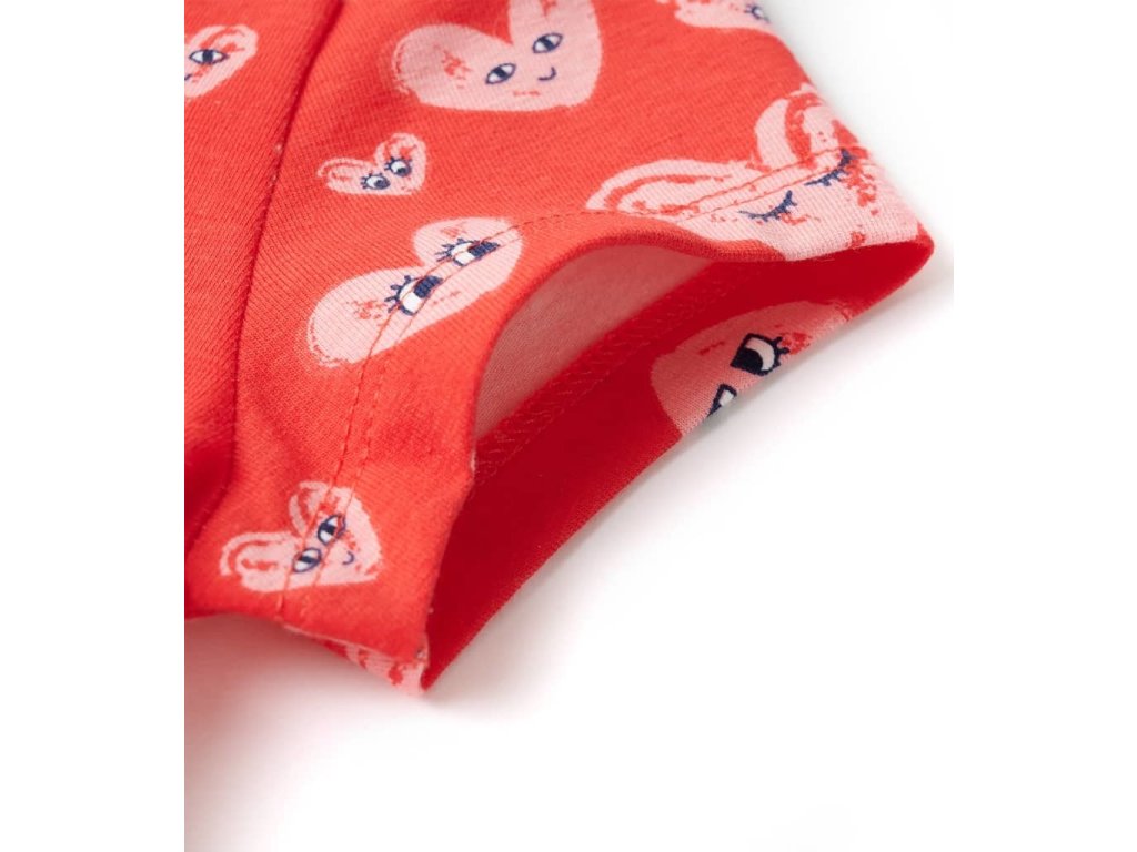 Tento dětský overal má krátké rukávy, kulatý výstřih, stahovací šňůrku v pase, 2 přední kapsy a zapínání na řadu patentek. Tento dětský overal je celý potištěný roztomilými kreslenými srdíčky. Dětský overal je vyroben z měkkého materiálu, který obsahuje 95 % bavlny a 5 % elastanu, takže je pohodlný a prodyšný.