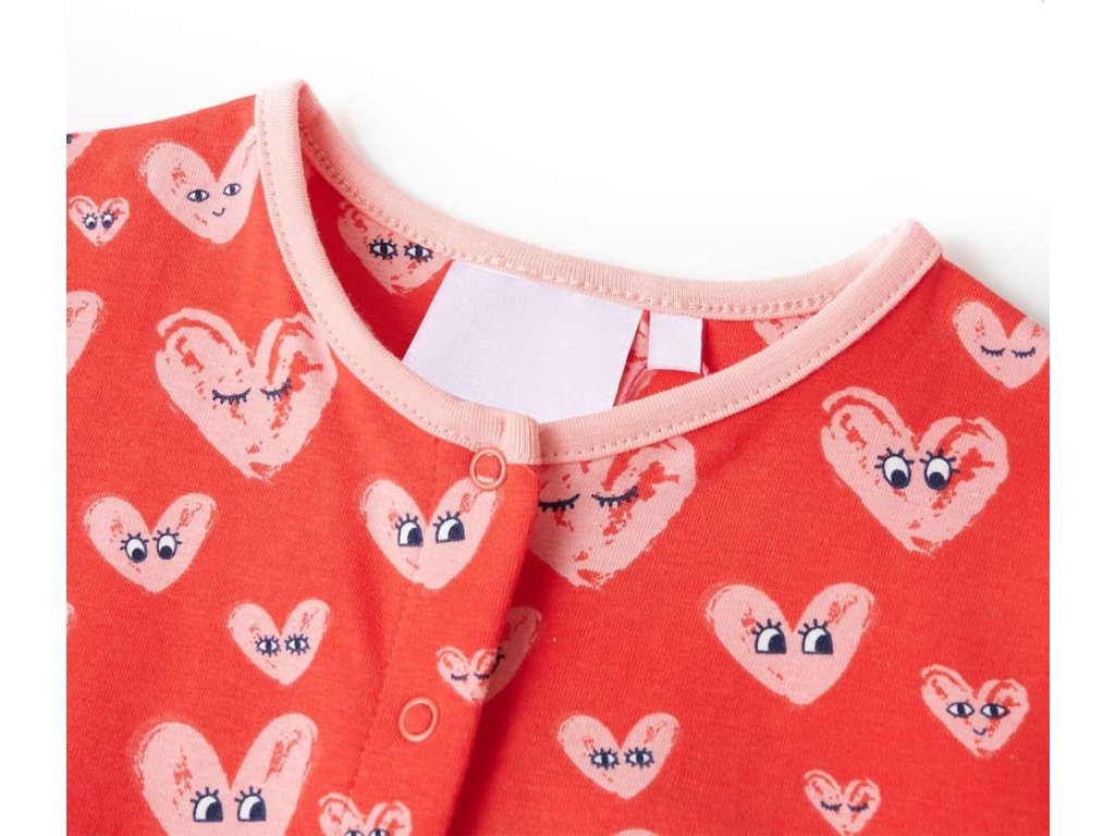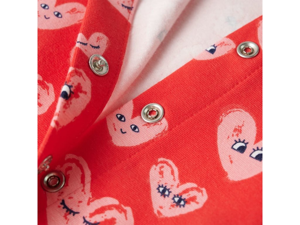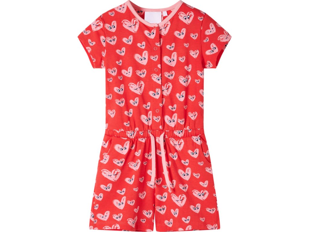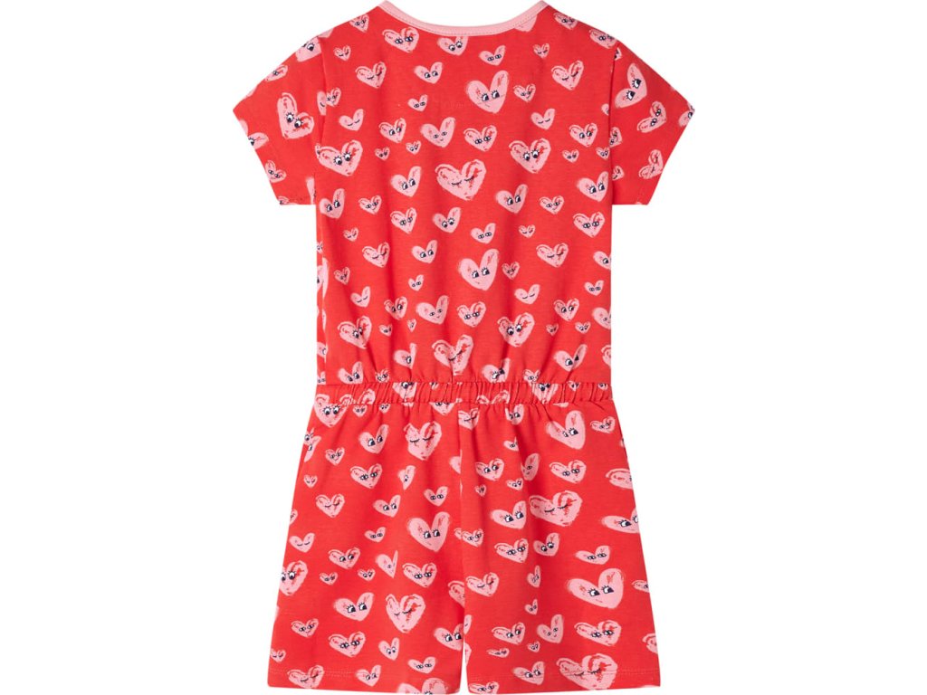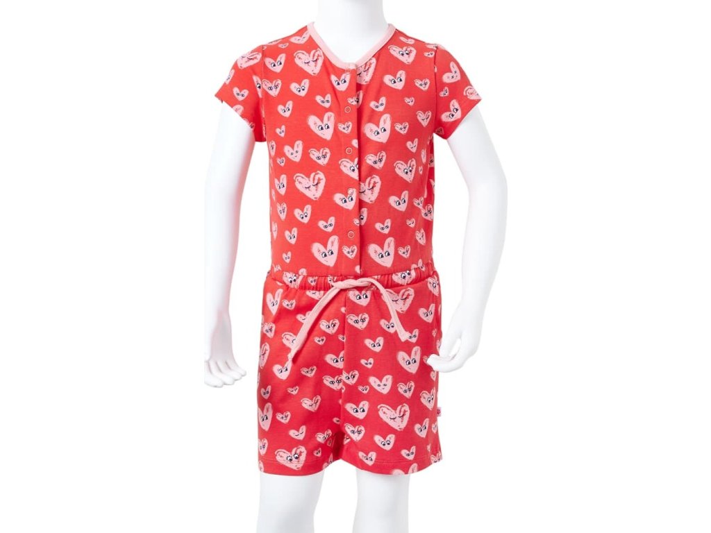 Tento dětský overal má krátké rukávy, kulatý výstřih, stahovací šňůrku v pase, 2 přední kapsy a zapínání na řadu patentek. Tento dětský overal je celý potištěný roztomilými kreslenými srdíčky. Dětský overal je vyroben z měkkého materiálu, který obsahuje 95 % bavlny a 5 % elastanu, takže je pohodlný a prodyšný.