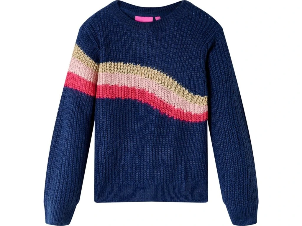 Tento dětský svetr má dlouhé rukávy, kulatý výstřih a rovný střih. Tento dětský svetr má vlnité detaily ve 3 barvách. Dětský svetr je vyroben z měkkého a pružného materiálu s žebrovaným úpletem, který zajišťuje větší teplo a pohodlí.