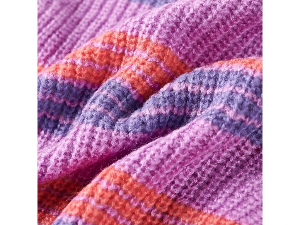Tento dětský svetr má dlouhé rukávy, kulatý výstřih a rovný střih. Tento dětský svetr má veselé pruhy v jasných barvách. Dětský svetr je vyroben z měkkého a pružného materiálu s žebrovaným úpletem, který zajišťuje větší teplo a pohodlí.