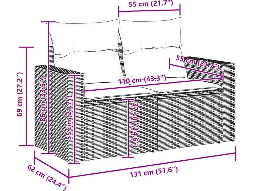 - 2 x křeslo: 131 x 62 x 69 cm (D x Š x V)