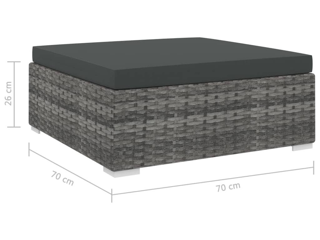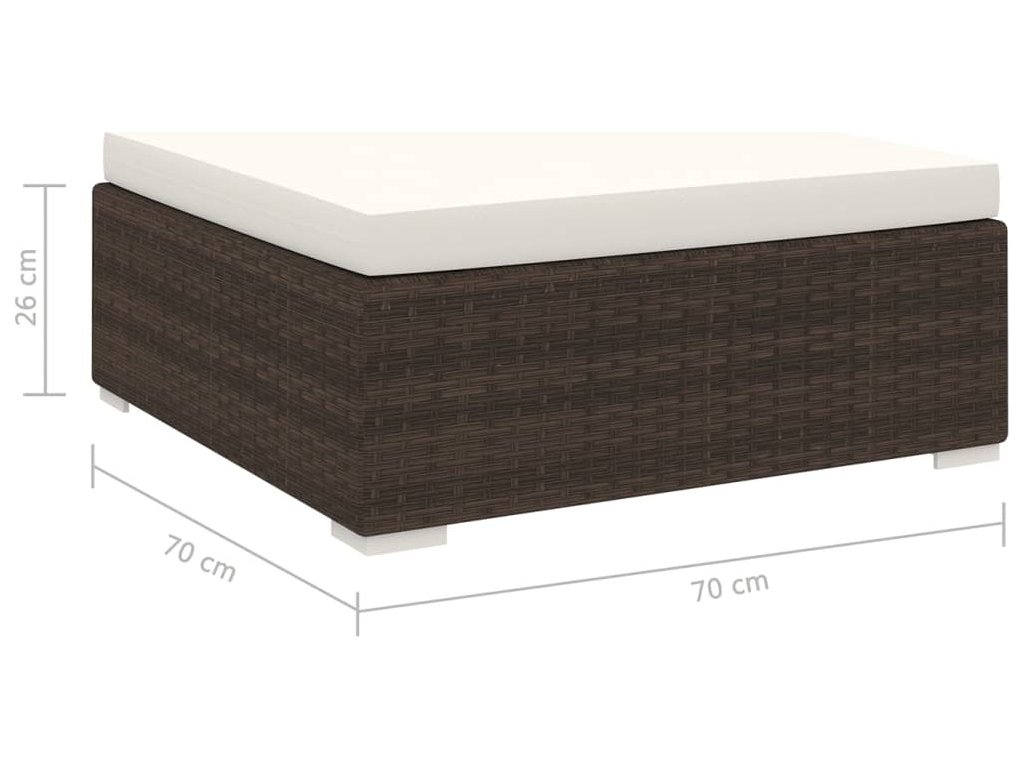 Podnožka je zhotovená z PE ratanu, který skvěle vzdoruje vodě a povětrnostním vlivům, takže se snadno čistí, hodně toho vydrží a je vhodná pro každodenní použití. Sedačka má robustní ocelový rám s práškovým nástřikem, který jí zajišťuje dlouhou životnost. Je také lehká a modulární, a tudíž velmi flexibilní – snadno ji přemístíte do jakéhokoli prostředí. Silné odnímatelné podušky jsou velmi pohodlné. Můžete ji kombinovat s různými rohovými a středovými sedacími díly, které najdete v naší rozbalovací nabídce. Perfektní způsob, jak si vytvořit sedací soupravu podle vašich představ! Příklady najdete na posledních 9 obrázcích.