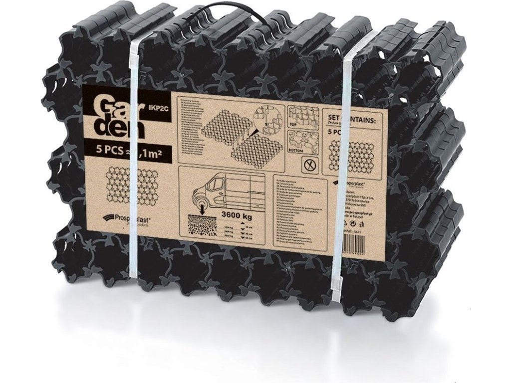 Speciální dlaždice Prosperplast PLANT jsou vhodné pro zatravňování ploch. Využijete je ovšem i při zpevňování příjezdových cest, které jsou náchylné k tvorbě bláta a vyjetých kolejí. Zasazená tráva poroste otvory v dlaždici. Zajistí vám přirozený vzhled dvora či chodníků na zahradě. Maximální zatížení dlaždic je 3600 kg.
