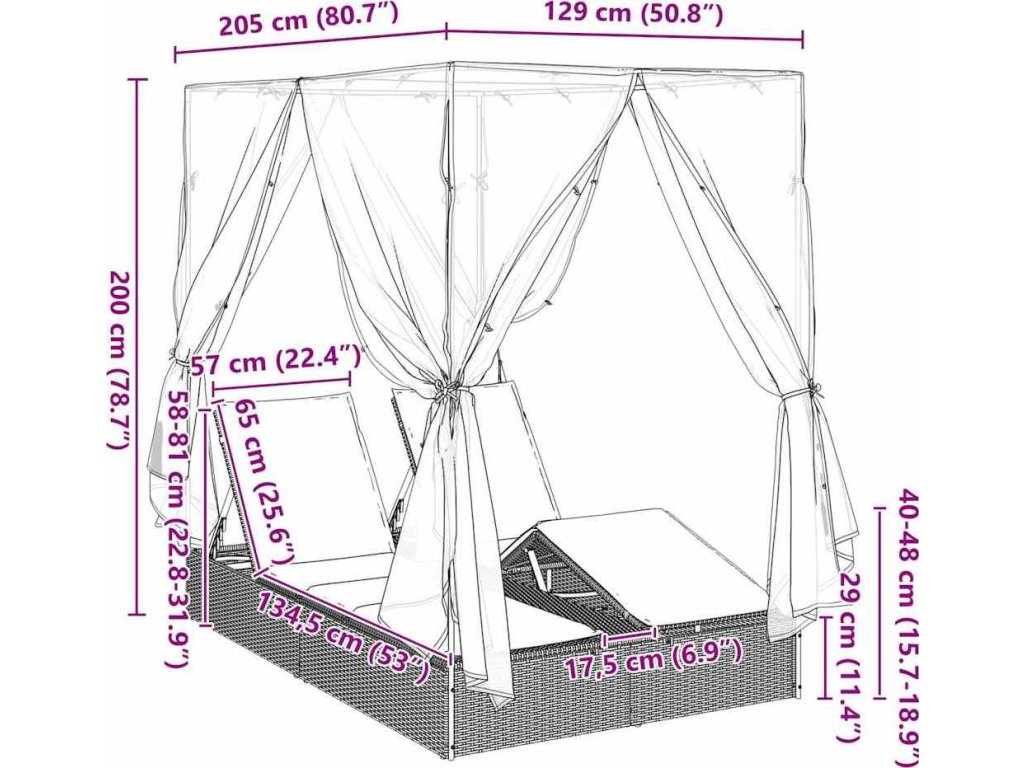 - Prémiové materiály: Lehátko je z odolného polyratanu a má pevný ocelový rám, takže vydrží různé povětrnostní podmínky a stále bude vypadat dobře. Materiály zaručují dlouhou životnost a udržení funkce a estetiky po roky.