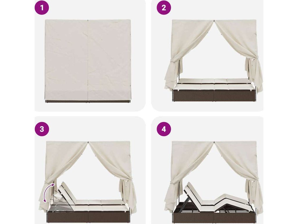 - Součásti: S vybavením se střechou a osmi závěsy, tahle souprava skvěle slouží pro soukromí. Dva sedací polštáře s odnímatelnými potahy zvyšují komfort a dělají relaxaci příjemnější. Lehátko má elegantní design s možnostmi nastavení, což vám ulehčí robotu.