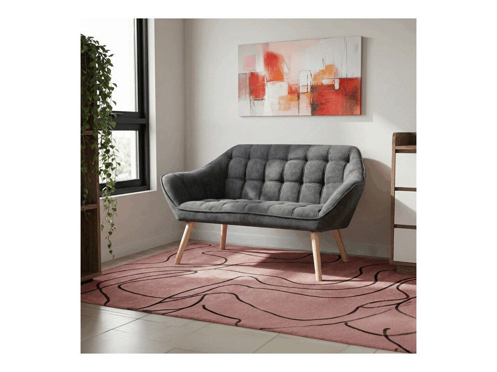 Dvoumístná sedačka v skandinávském stylu s kubistickými prvky. Charakteristickými prvky této dvojsedačky je výrazné čtvercové prošití sedáku i opěráku, masivní sedací korpus s ostrými liniemi v kontrastu s vysokými štíhlými nohami. Sedačka je celočalouněná, včetně zad. Lze ji použít jak k přisazení ke stěně, tak i ve středu místnosti. Může sloužit jako výrazný solitér, nebo s křesly jako sedací souprava. Své uplatnění najde v chodbě, hale, obývacím pokoji i ložnici. Potah je z látky v tmavě šedém odstínu, kostra z masivního dřeva, vyplněné je kvalitní PU pěnou. Sedáky jsou ještě zpevněny elastickými popruhy pro zvýšení komfortu pohodlí. Štíhlé kónické nohy jsou z masivního kaučukovníku v přírodním odstínu a lakované transparentním lakem. Poškození podlahových krytin je eliminováno plastovými kluzáky, u zadních nohou jsou rektifikovatelné (výškově nastavitelné). Světlá výška sedačky je 30 cm , výška područek je 59 cm a šíře 10 cm. Nosnost je 150 kg. Pohodlí a vnitřní prostornost této sedačky ocení jistě každý. A pokud si ještě opřete ruce o zvýšené područky a nebo si lehnete, budete dlouho otálet, než sedačku opustíte. Sedačka se typově hodí ke křeslu AK-321.