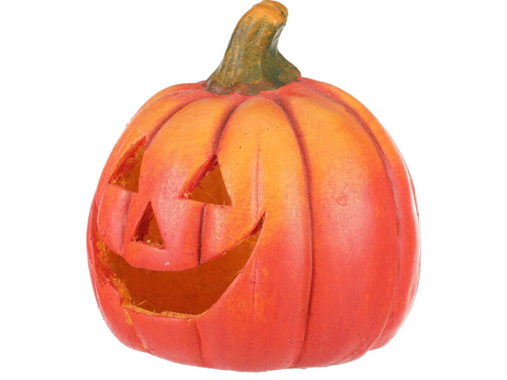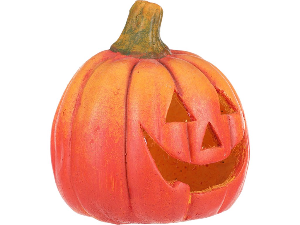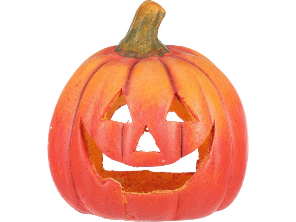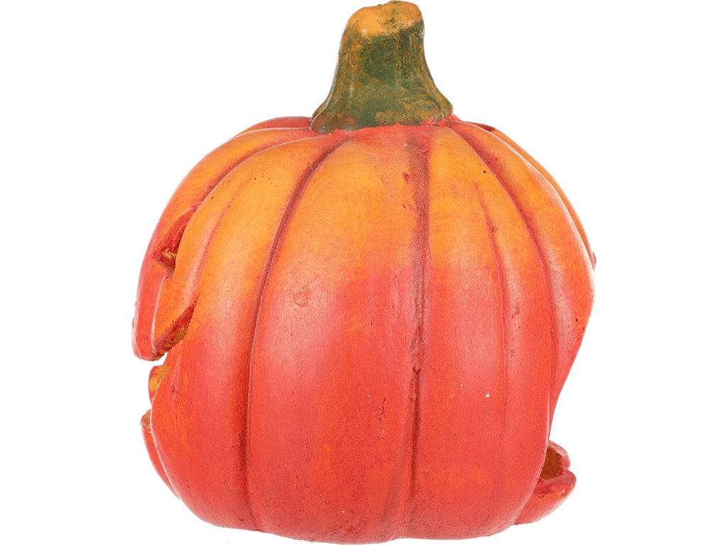 Keramická dýně ve výrazných oranžovo-červených odstínech slouží jako dekorativní svícen s vyřezávanými otvory ve tvaru obličeje. Její povrch má jemnou texturu terakoty, která dodává autentický vzhled a příjemný vizuální efekt. Díky otvorům je vhodná pro umístění svíčky, která vytváří teplé a atmosférické osvětlení. Dýně je stabilní a díky keramickému materiálu snadno udržovatelná, ideální pro podzimní a halloween dekorace.