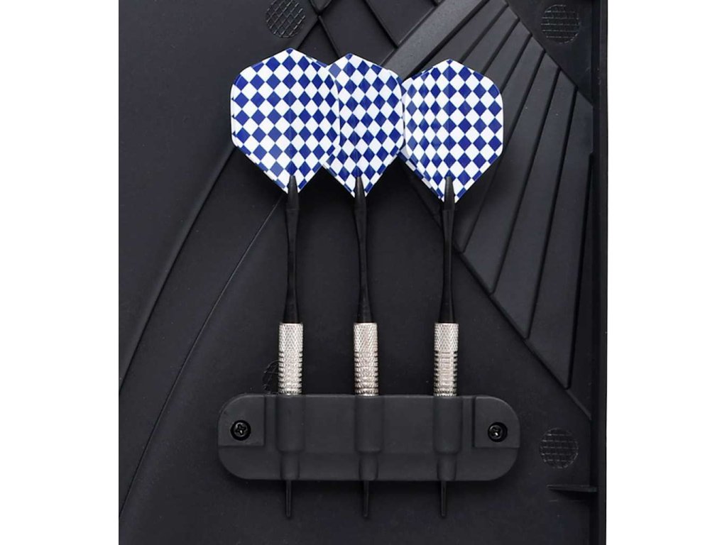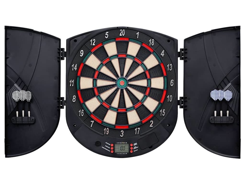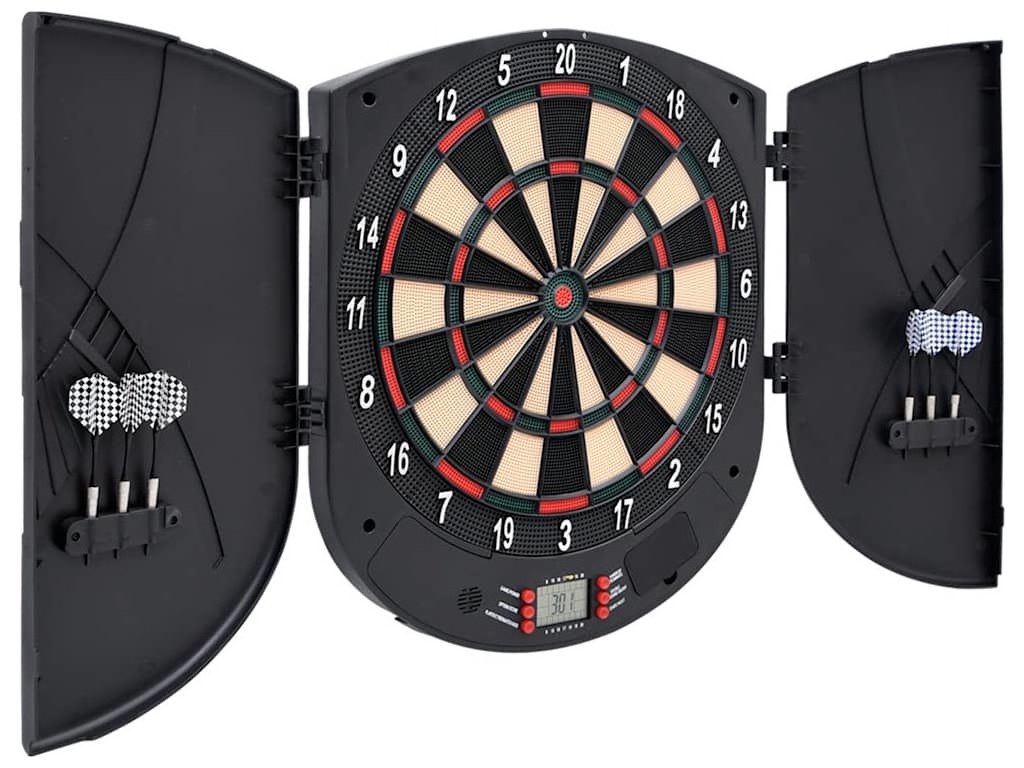 - Extra ochrana: Pro prodloužení životnosti této hry je terč s LCD displejem navržen se dvěma bočními dvířky, která zvětšují okolní plochu. Obě strany lze navíc využít k uložení šipek.