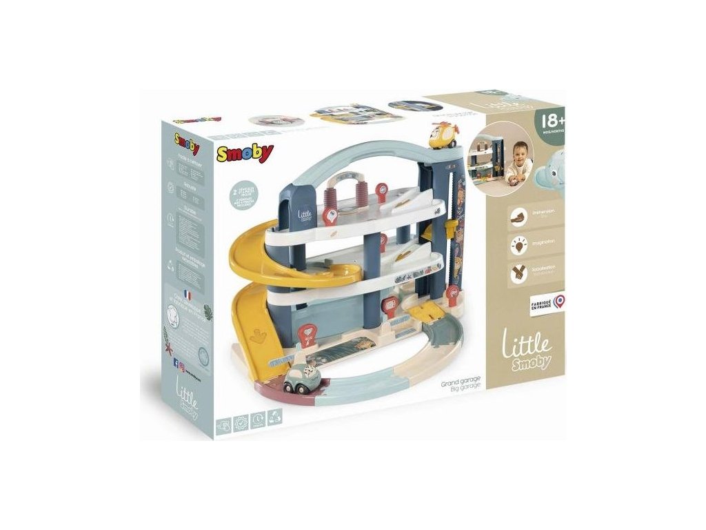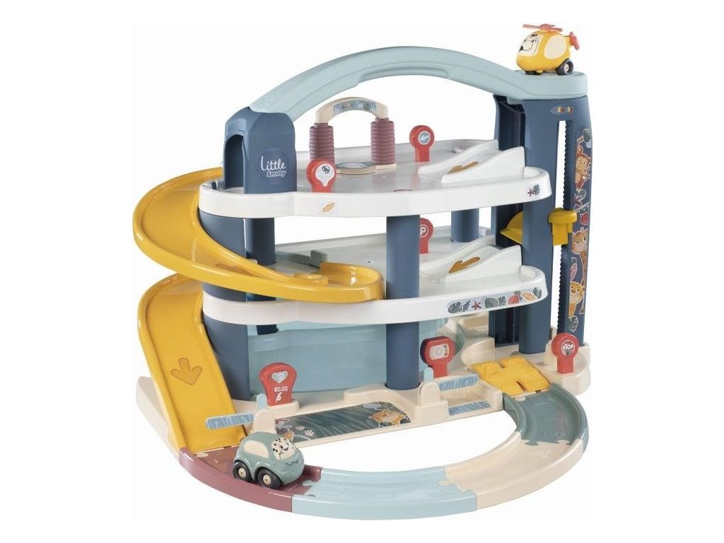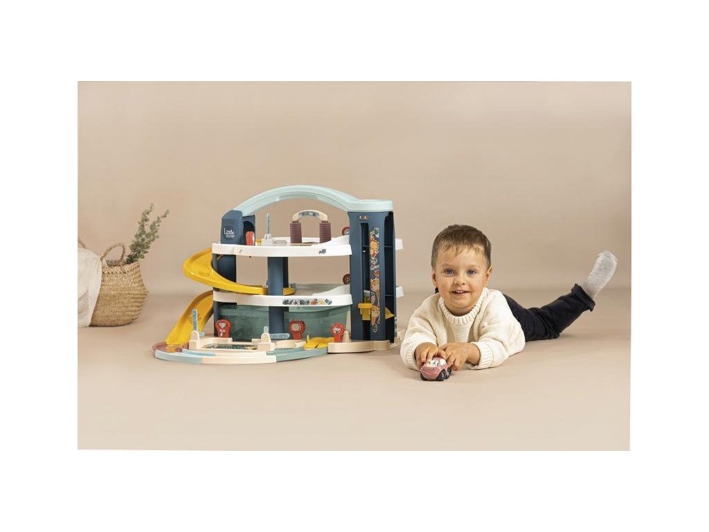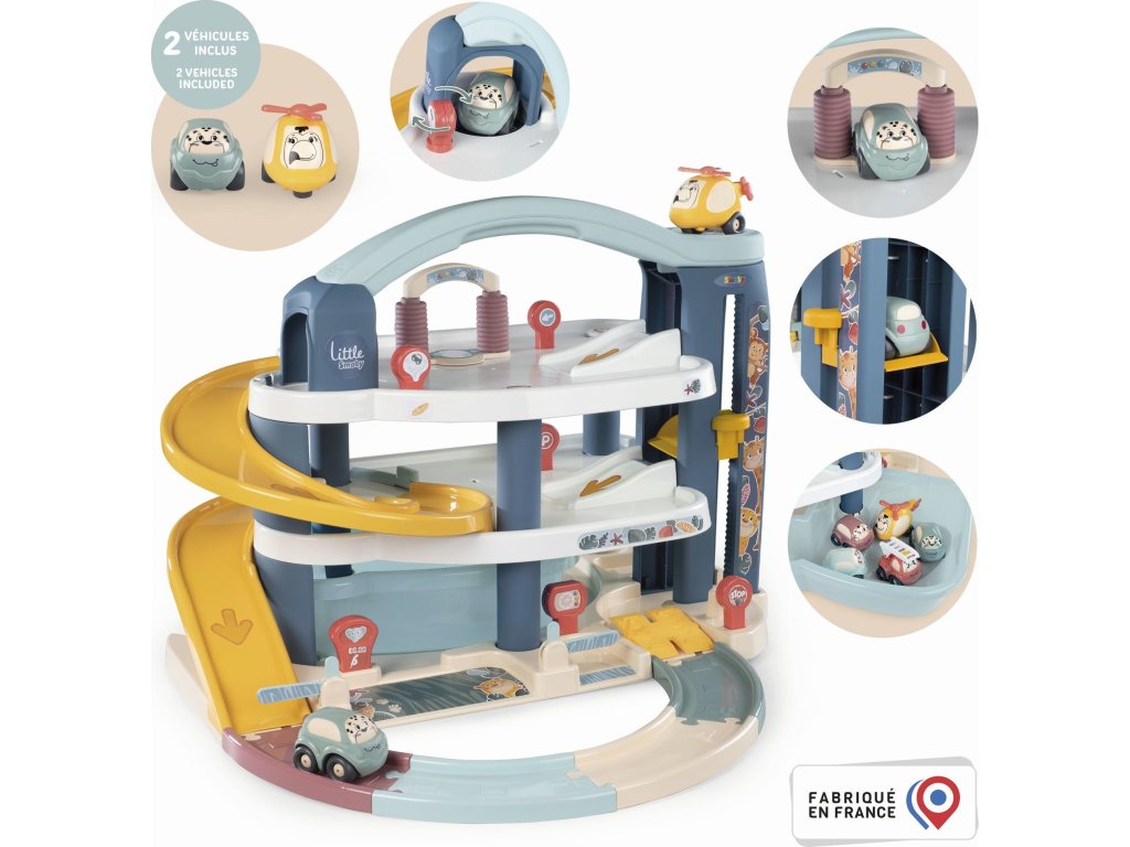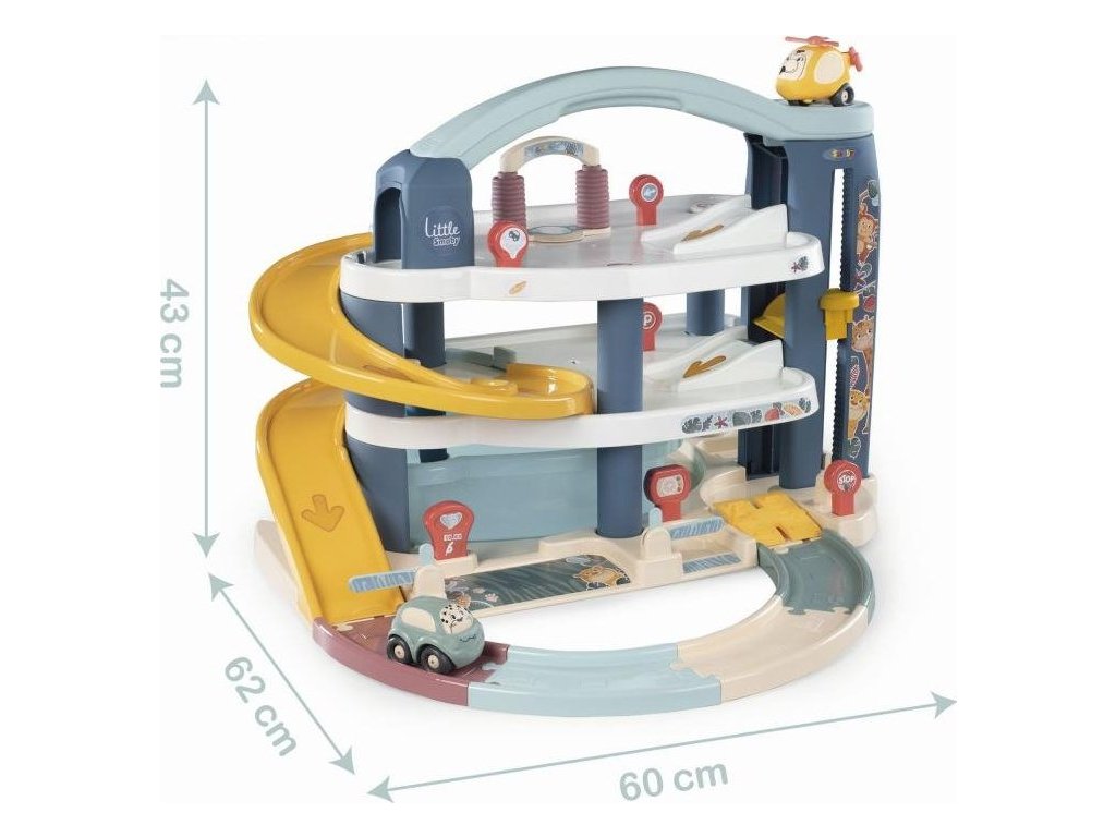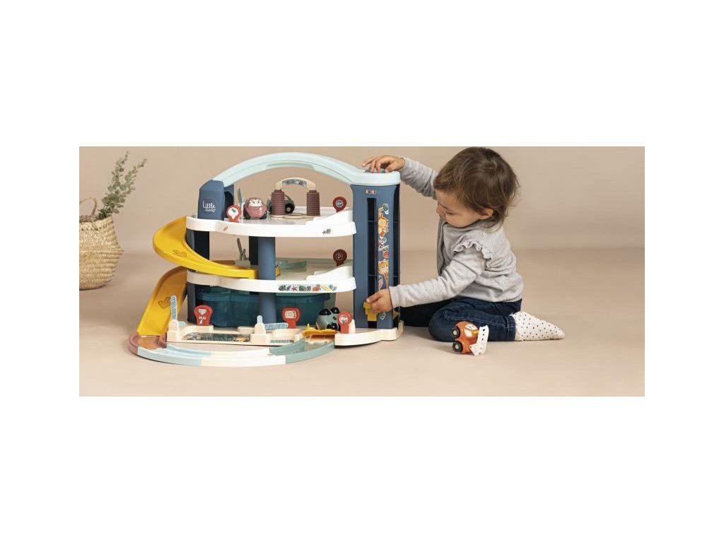 Velká patrová parkovací garáž Little Smoby zabavý vaše děti na dlouhé hodiny plné zábavy. Na 3 podlažích je co objevovat. Mini autíčka pohodlně cestují výtahem, sjíždí přes široké tratě nebo tajnou cestou, kterou můžete snadno otevřít pákou. Součástí je myčka, servisní dílna se zvedací plošinou, benzínová pumpa a úložný box. Sada obsahuje mini autíčko a mini vrtulník. Velké vícepodlažní parkoviště je vyrobeno v osvědčené Smoby kvalitě ze zdravotně nezávadných materiálů.