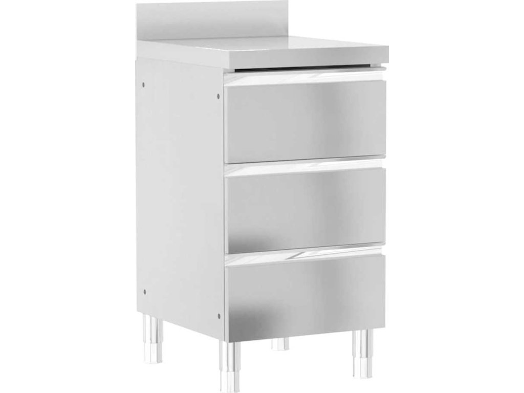 Tato úložní skříňka je vyrobená z kvalitní nerezové oceli a je robustní, antikorozní a snadno se čistí. Skříňka poskytuje dostatek úložného prostoru pro úklidové vybavení a příslušenství. Nastavitelné nožičky umožňují vyrovnat skříňku i na nerovné ploše. Součástí skříňky je 10 cm vysoký zadní lem a otvor na vodní trubku.