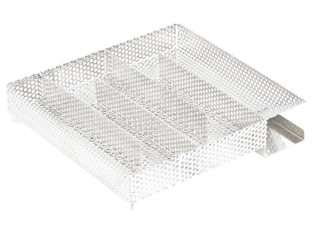 - Pevná mřížková konstrukce: Kompaktní mřížka čtvercového tvaru umožňuje rovnoměrné a pomalé hoření třísek až po dobu 12 hodin. Délka trvání závisí především na druhu dřeva určeného k uzení. Pro dosažení nejlepších výsledků se doporučuje používat štěpky o velikosti zrn 0,5–2,0 mm.