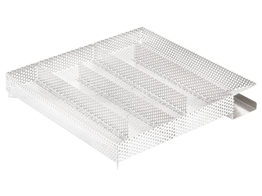 - Pevná mřížková konstrukce: Kompaktní mřížka čtvercového tvaru umožňuje rovnoměrné a pomalé hoření třísek až po dobu 16 hodin. Délka trvání závisí především na druhu dřeva určeného k uzení. Pro dosažení nejlepších výsledků se doporučuje používat štěpky o velikosti zrn 0,5–2,0 mm.