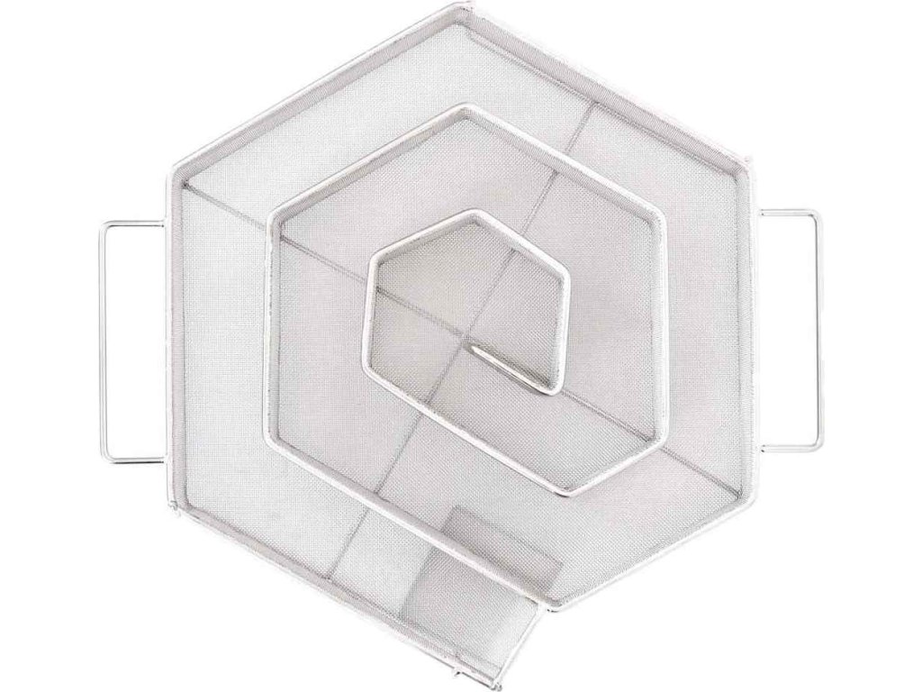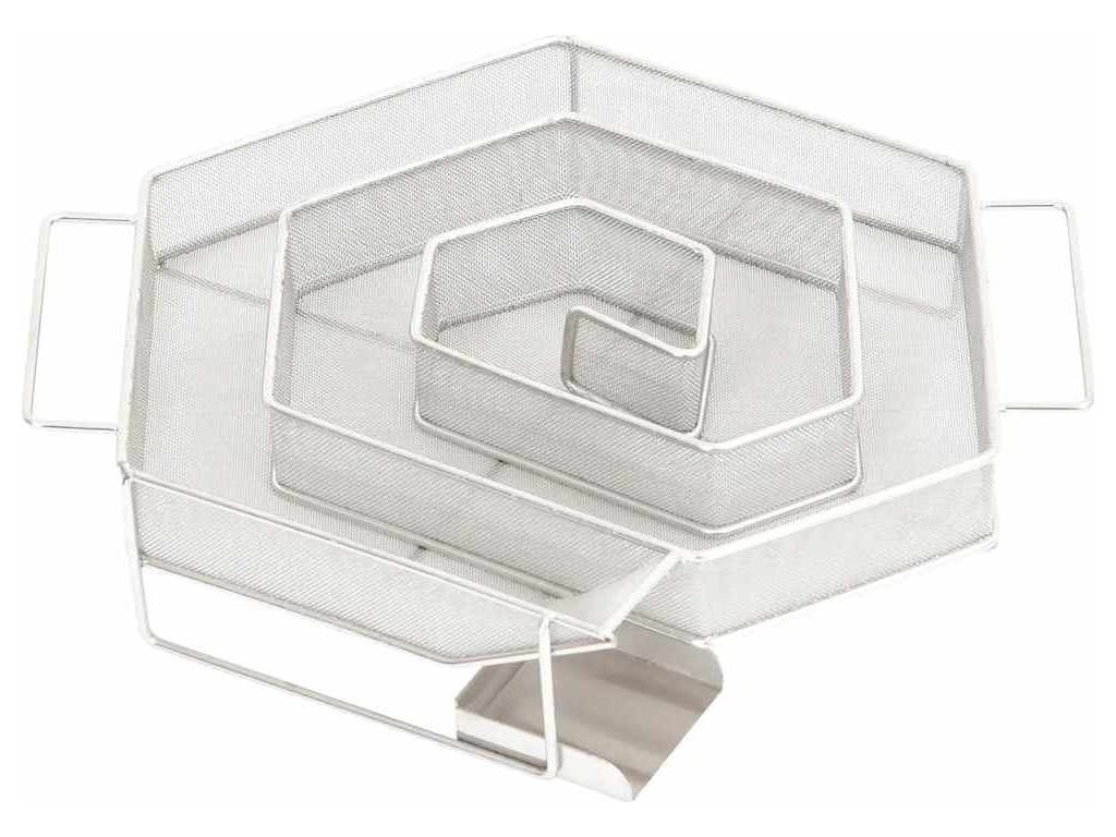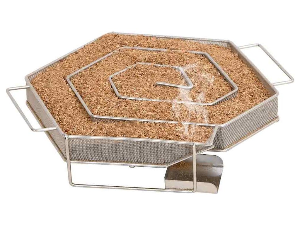 - Pevná mřížková konstrukce: Kompaktní mřížka ve tvaru šestiúhelníku umožňuje rovnoměrné a pomalé hoření třísek až po dobu 8 hodin. Délka trvání závisí především na druhu dřeva určeného k uzení. Pro dosažení nejlepších výsledků se doporučuje používat štěpky o velikosti zrn 0,5–2,0 mm.